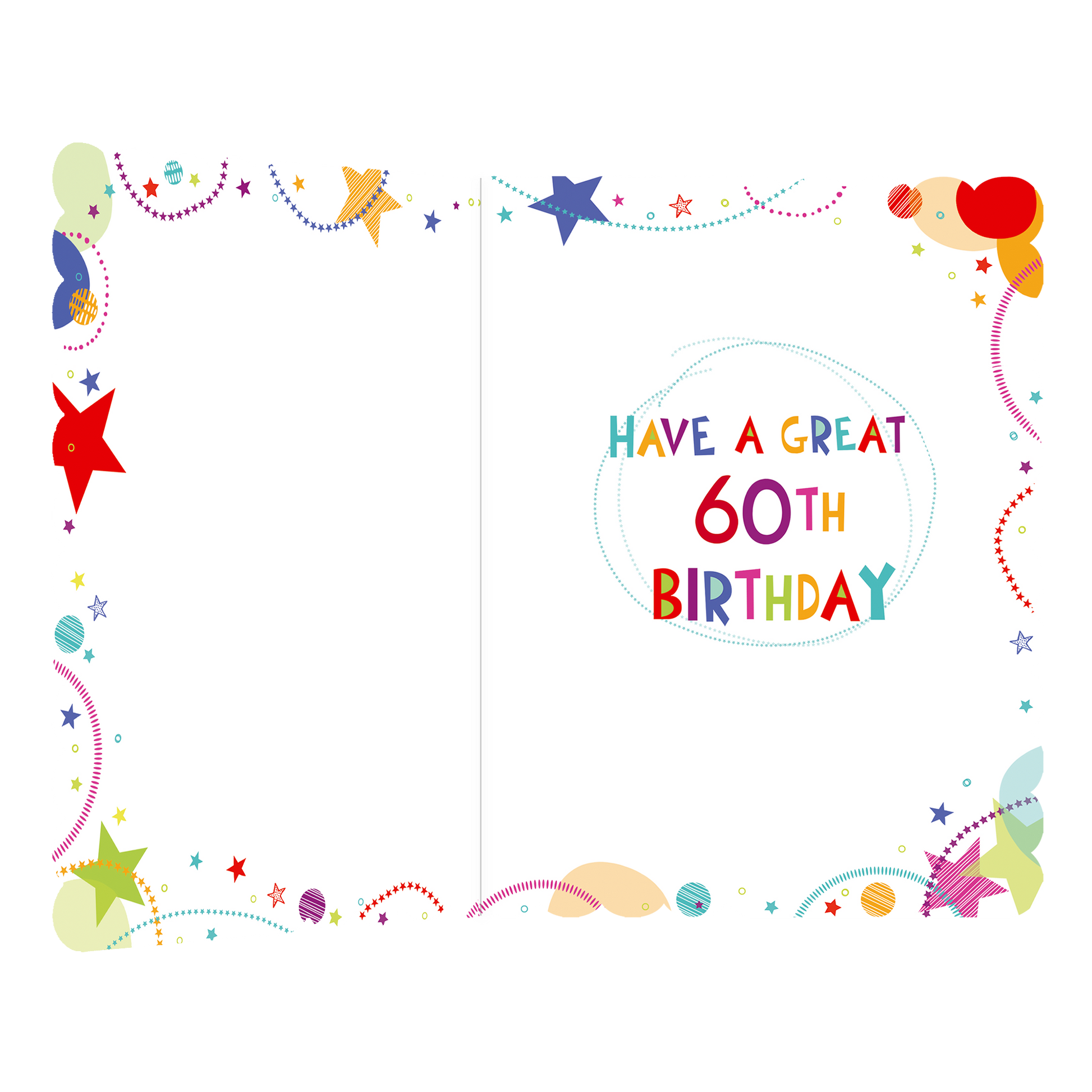 De wenskaart heeft een afmeting van x en een staande vorm. Op deze wenskaart staan sterren en stippen in de kleuren rood, geel, oranje, roze, blauw en beige, met in het midden de tekst: "Happy 60th birthday to you". De binnenzijde van de wenskaart is bedrukt met een ontwerp passend bij de voorzijde van de kaart en de tekst "Have a great 60th birthday".