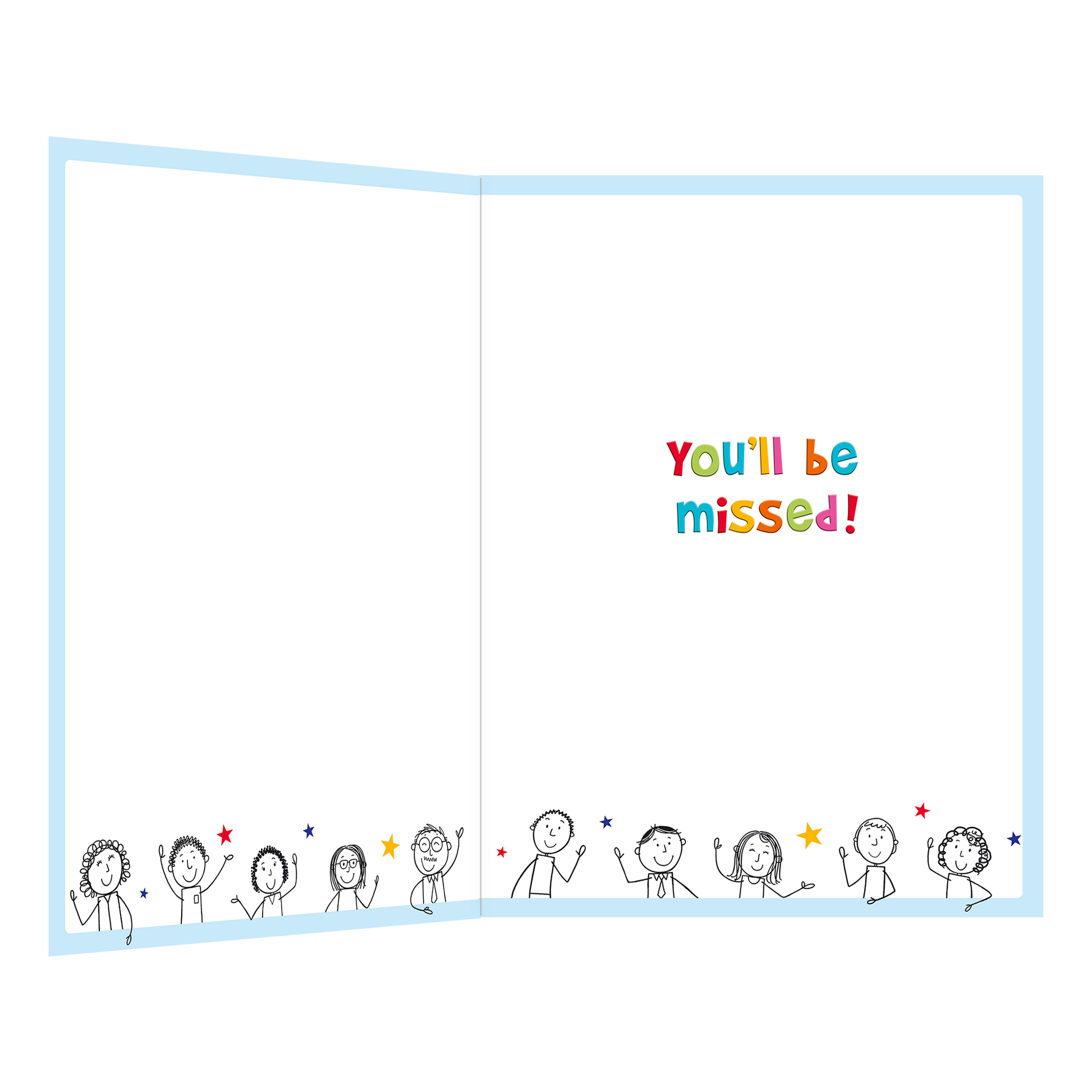 De wenskaart heeft een afmeting van x en een staande vorm. Op deze wenskaart staat de tekst: "So sorry you're leaving" omringt door getekende mensen. De binnenzijde van de wenskaart is bedrukt met een ontwerp passend bij de voorzijde van de kaart en de tekst "You'll be missed!".