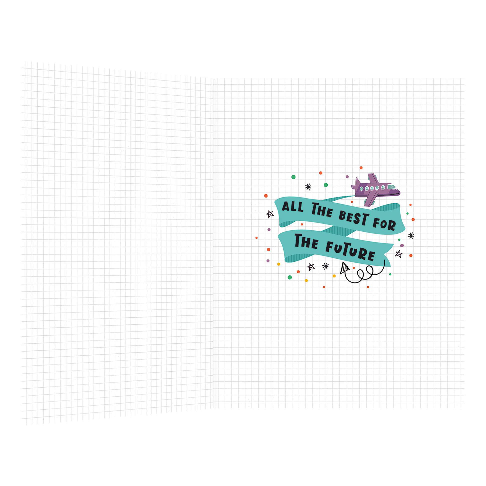 De wenskaart heeft een afmeting van x en een staande vorm. Op deze wenskaart staat een vliegtuig en een helikopter die de tekst: "It's time to say goodbye, good luck and" omringen. De binnenzijde van de wenskaart is .
