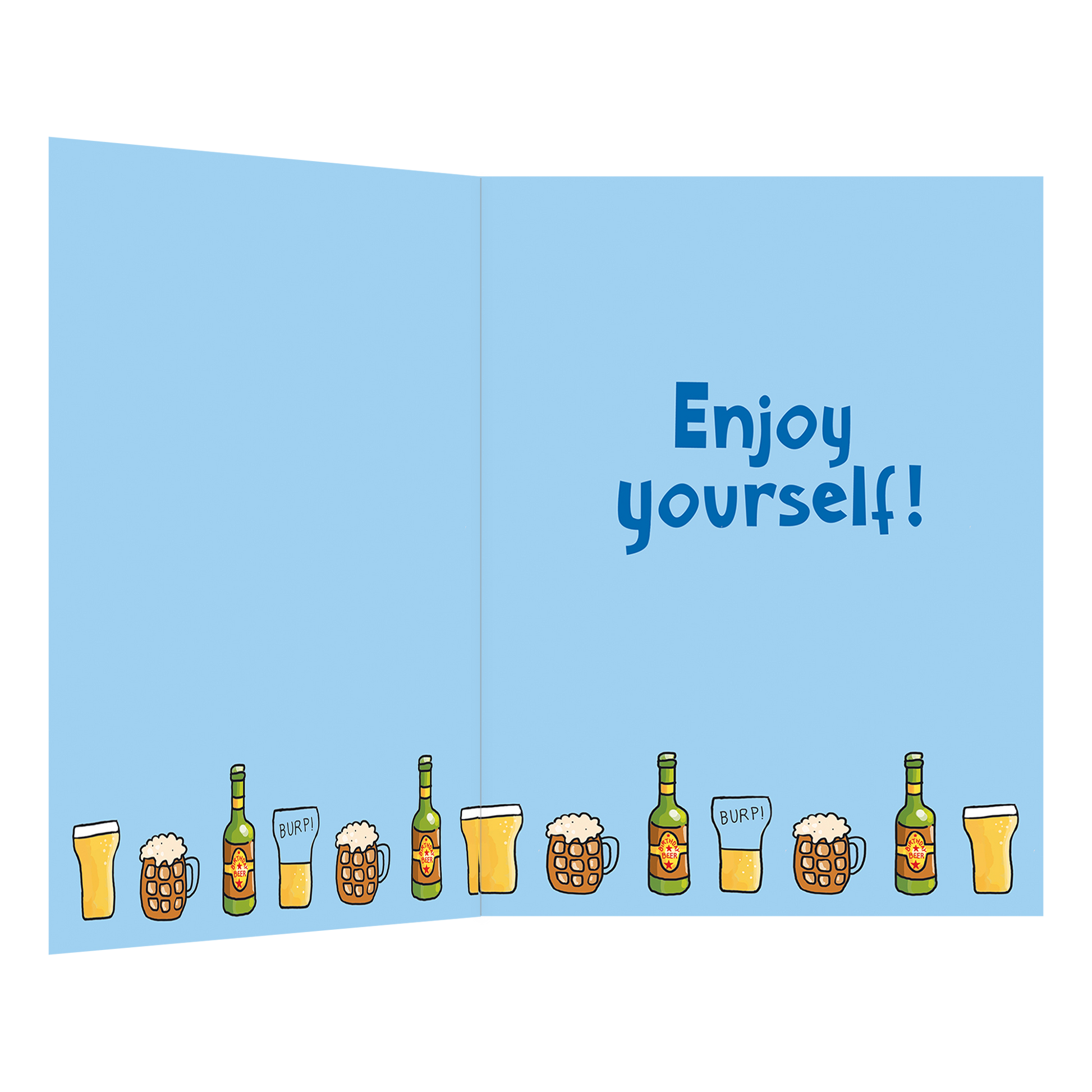 De wenskaart heeft een afmeting van x en een staande vorm. Op deze wenskaart staat de tekst: "Happy birthday have a great day!" omringt door biertjes. De binnenzijde van de wenskaart is bedrukt met een ontwerp passend bij de voorzijde van de kaart en de tekst "Enjoy yourself!".