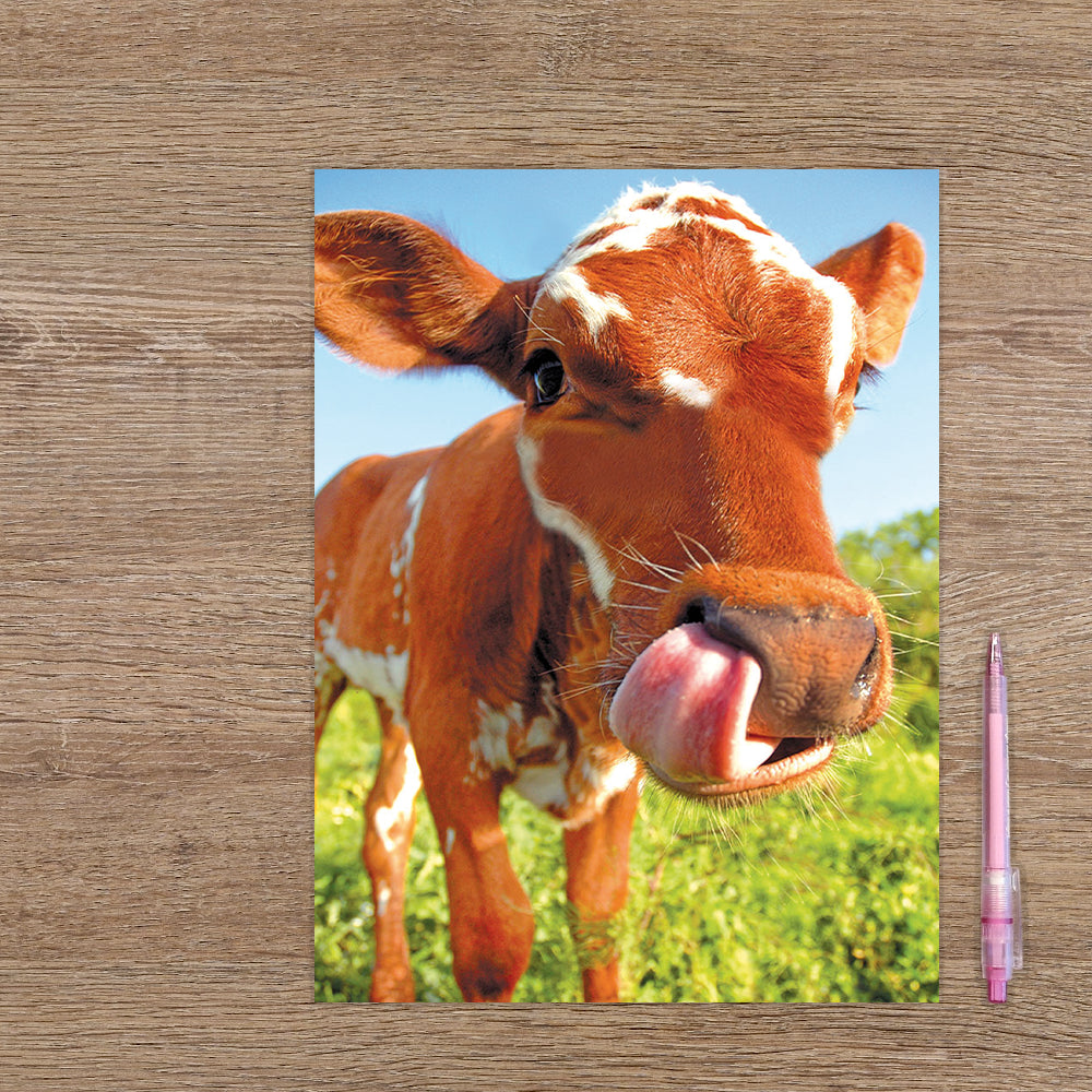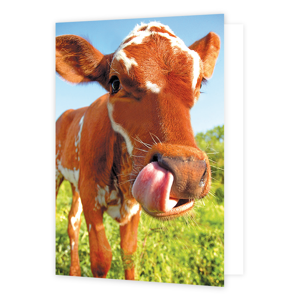 De wenskaart heeft een afmeting van x en een staande vorm. Op deze wenskaart staat een koe in de wei. De binnenzijde van de wenskaart is blanco wat voldoende ruimte geeft om een persoonlijke boodschap te schrijven .