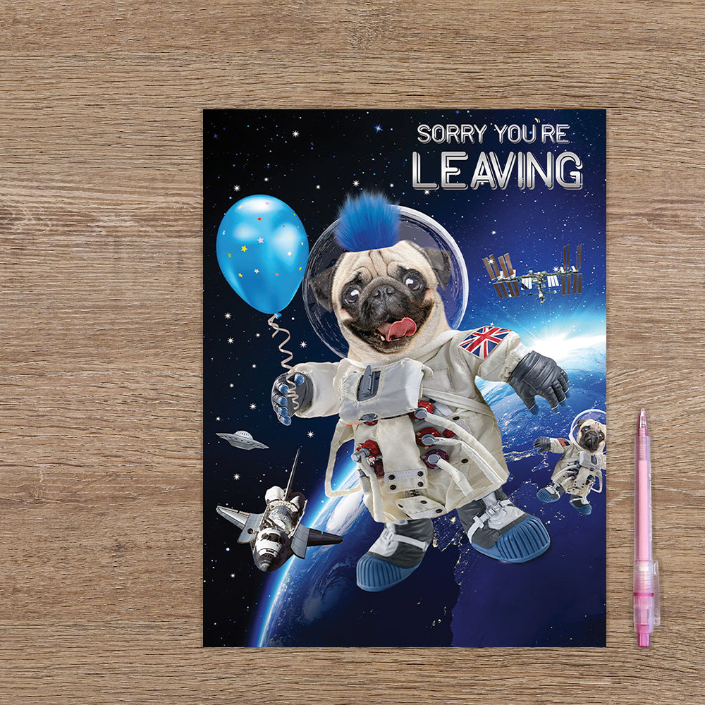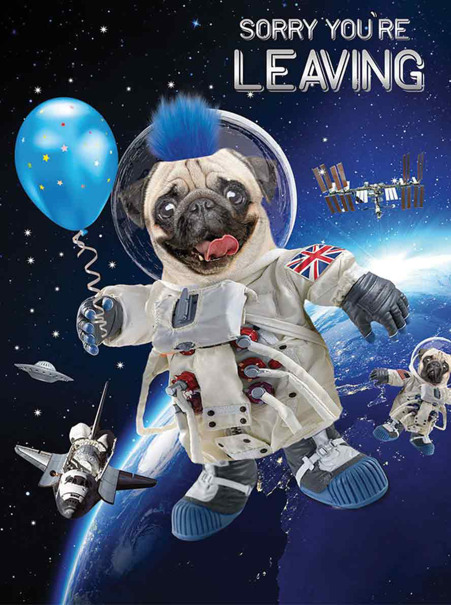De wenskaart heeft een afmeting van x en een staande vorm. Op deze wenskaart staat een hond die in de ruimte zweeft met een ruimtepak aan. In de illustratie staat de tekst: "Sorry you're leaving". De binnenzijde van de wenskaart is bedrukt met de tekst "Goodbye and good luck".