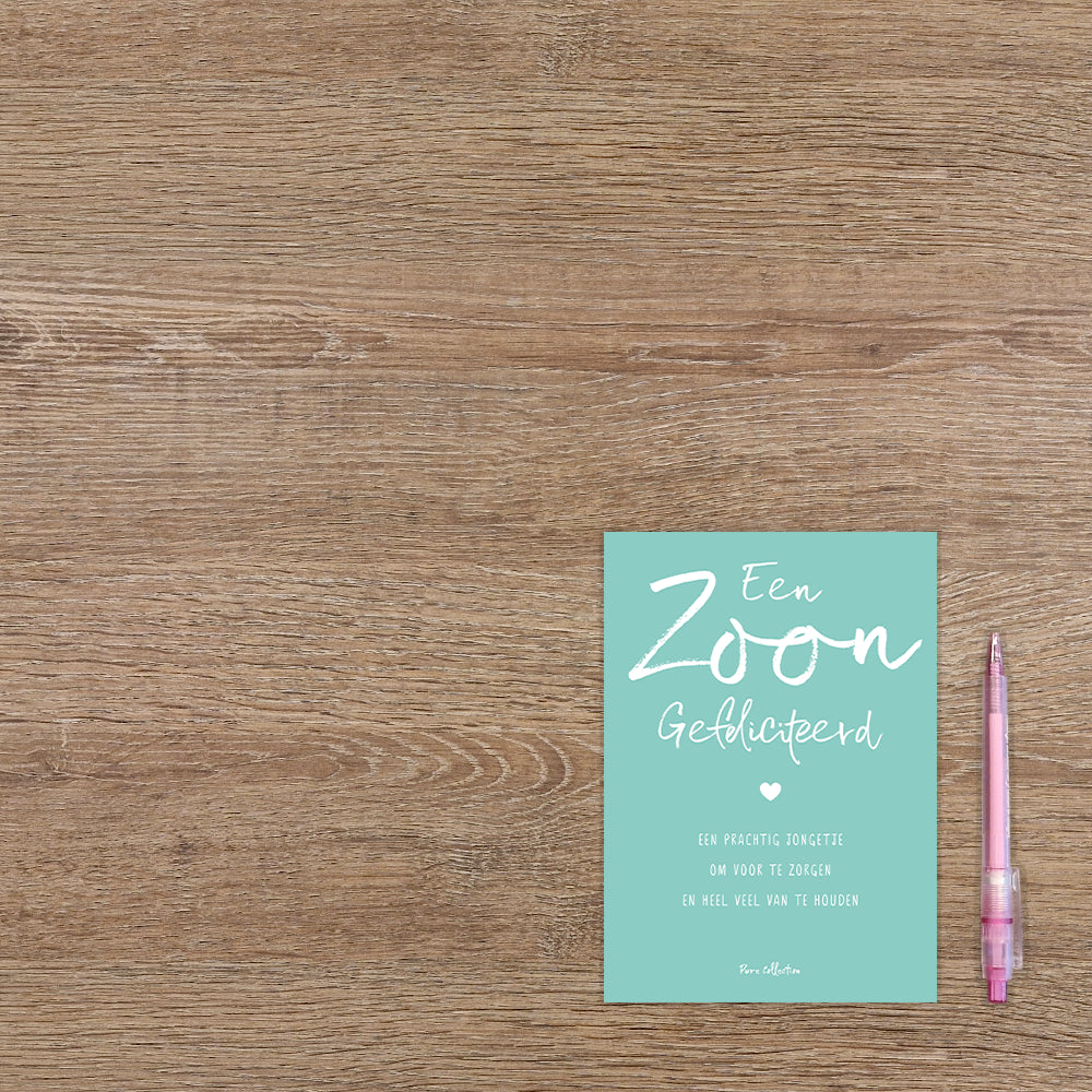 De wenskaart heeft een afmeting van x en een staande vorm. Op deze wenskaart staat de tekst: "Een zoon gefeliciteerd een prachtig jongetje om voor te zorgen en heel veel van te houden". De binnenzijde van de wenskaart is blanco wat voldoende ruimte geeft om een persoonlijke boodschap te schrijven .