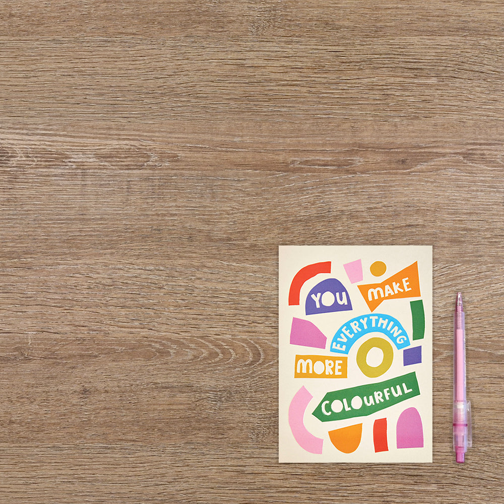 De wenskaart heeft een afmeting van x en een staande vorm. Op deze wenskaart staat de tekst:"You make everything more colourful" met diverse figuren. De binnenzijde van de wenskaart is blanco wat voldoende ruimte geeft om een persoonlijke boodschap te schrijven .