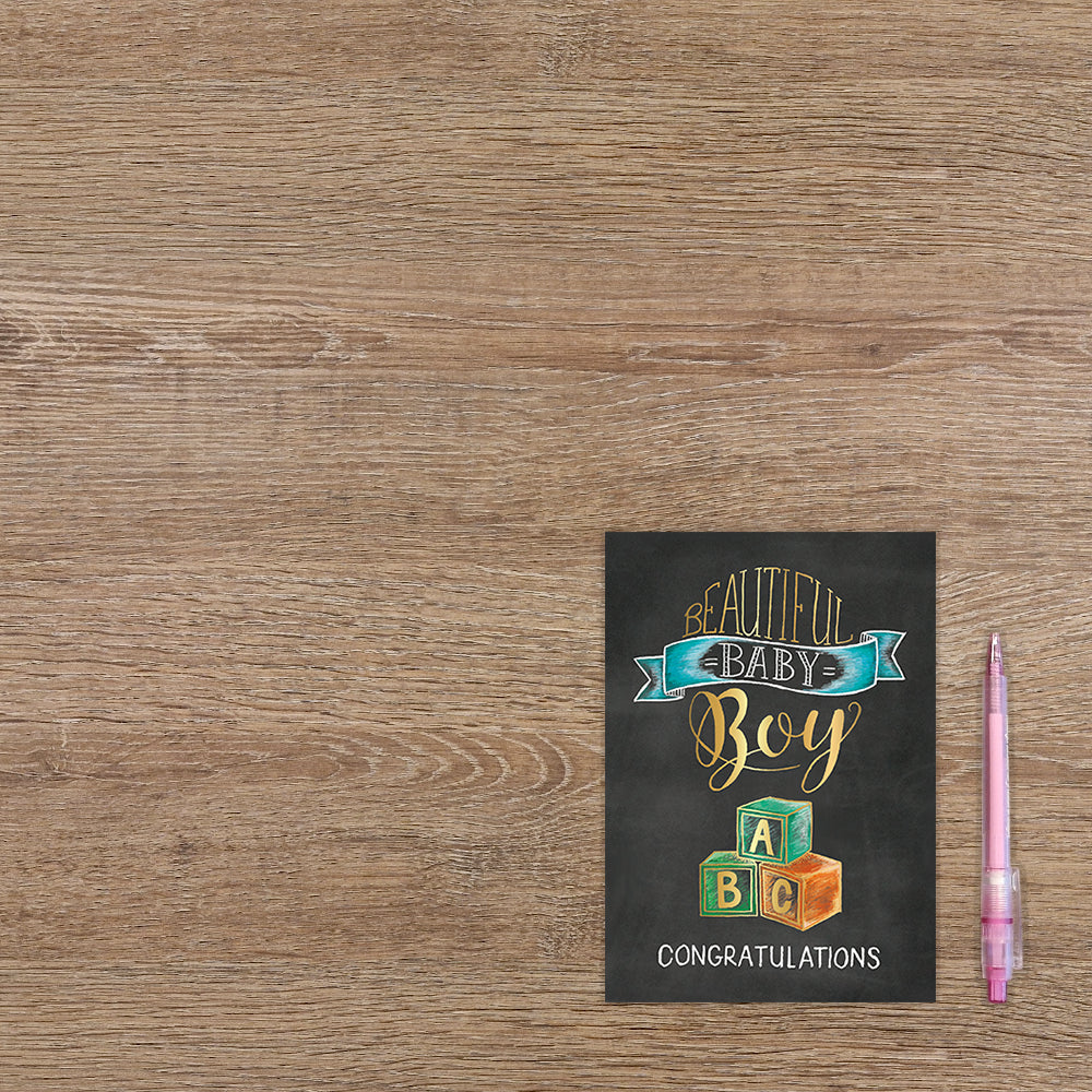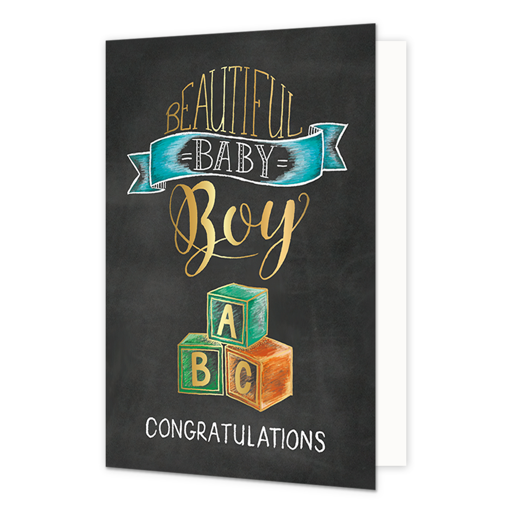 De wenskaart heeft een afmeting van x en een staande vorm. Op deze wenskaart staan babyblokken met daarboven de tekst: "Beautiful baby boy congratualtions". De binnenzijde van de wenskaart is blanco wat voldoende ruimte geeft om een persoonlijke boodschap te schrijven .