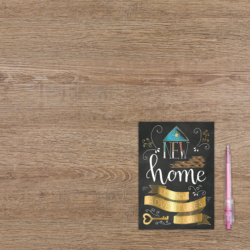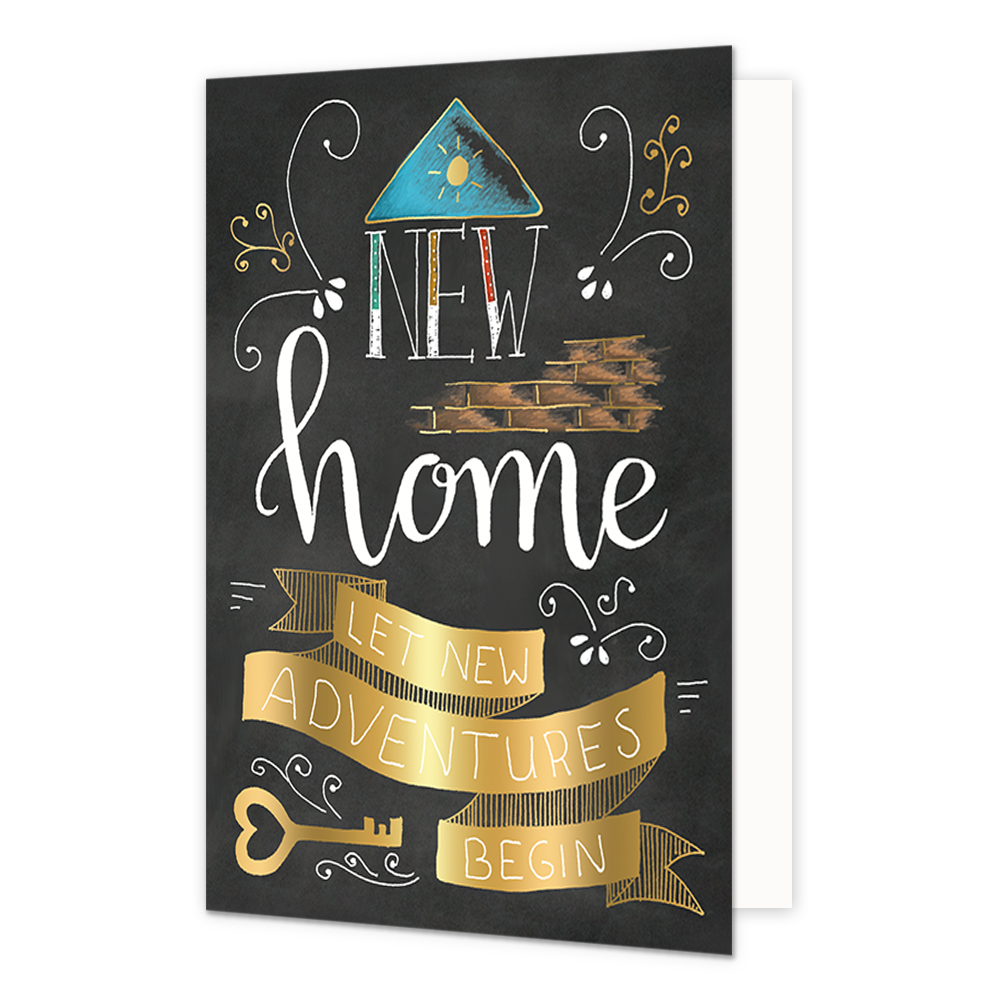 De wenskaart heeft een afmeting van x en een staande vorm. Op deze wenskaart staat de tekst: "New home let new adventures begin". De binnenzijde van de wenskaart is blanco wat voldoende ruimte geeft om een persoonlijke boodschap te schrijven .