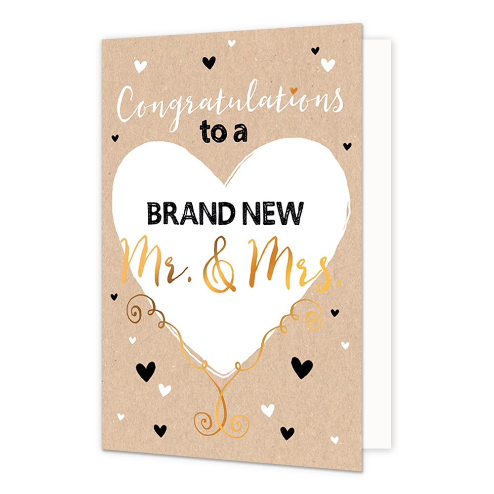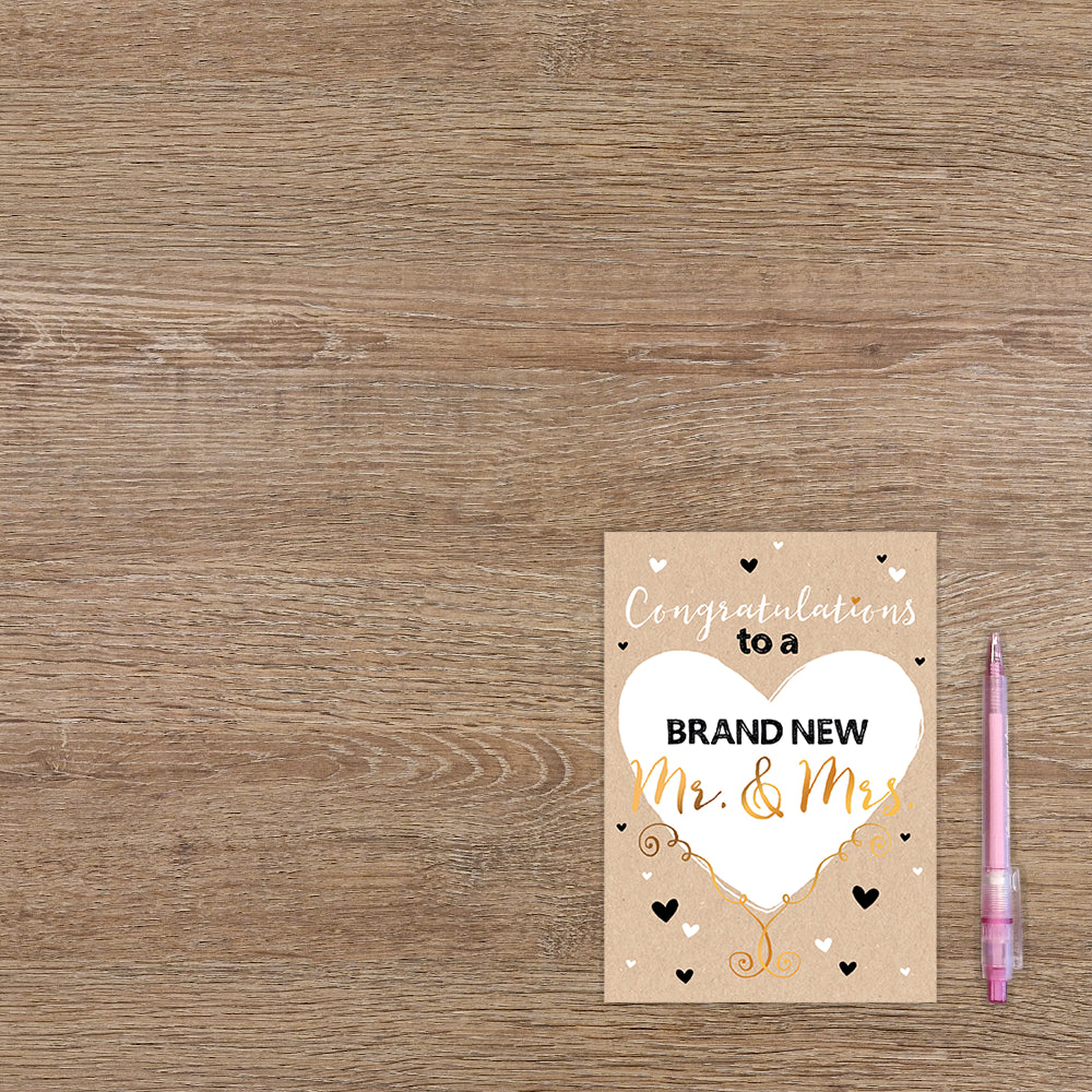 De wenskaart heeft een afmeting van x en een staande vorm. Op deze wenskaart staan hartjes met een groot wit hart in het midden met de tekst: "Congratulations to a brand new MR & MRS". De binnenzijde van de wenskaart is blanco wat voldoende ruimte geeft om een persoonlijke boodschap te schrijven .