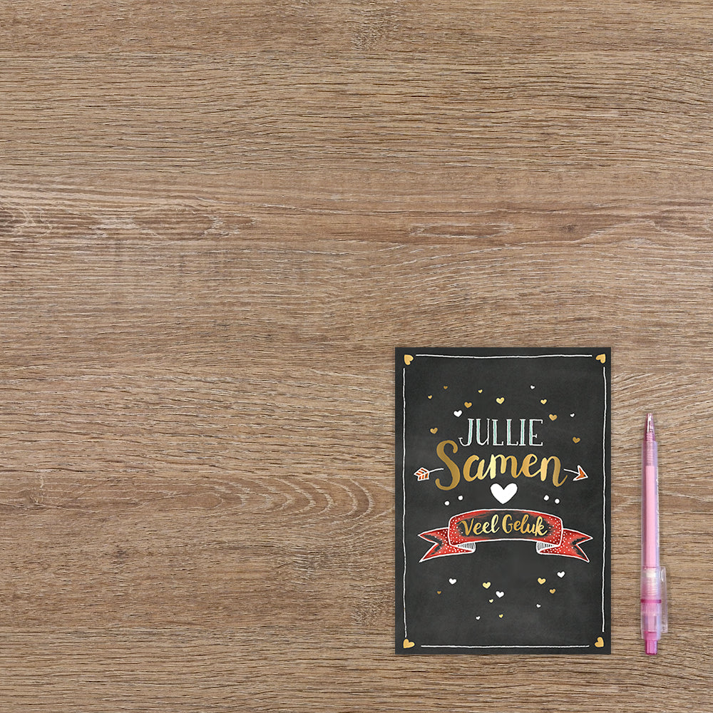 De wenskaart heeft een afmeting van x en een staande vorm. Op deze wenskaart staat de tekst: "Jullie samen veel geluk". De binnenzijde van de wenskaart is blanco wat voldoende ruimte geeft om een persoonlijke boodschap te schrijven .