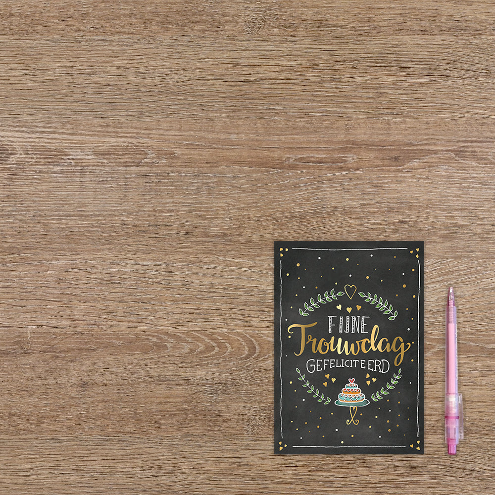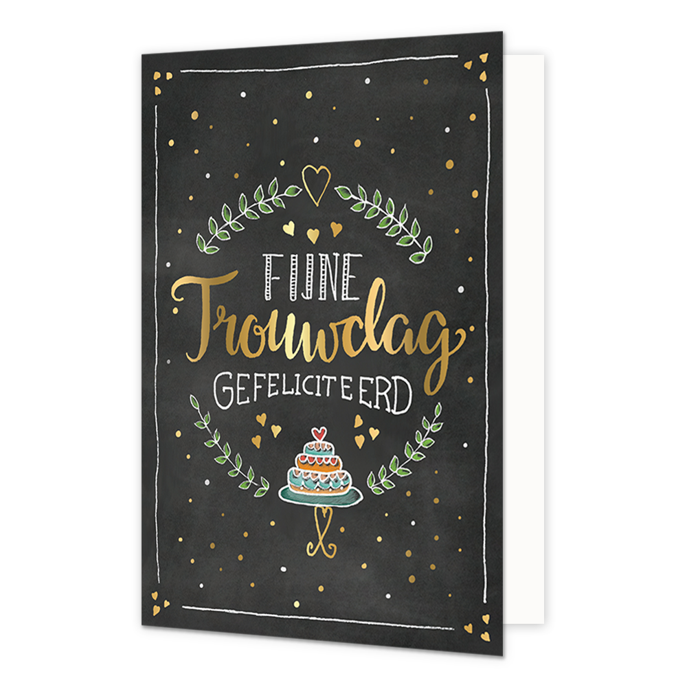 De wenskaart heeft een afmeting van x en een staande vorm. Op deze wenskaart staat de tekst: "Fijne trouwdag gefeliciteerd". De binnenzijde van de wenskaart is blanco wat voldoende ruimte geeft om een persoonlijke boodschap te schrijven .
