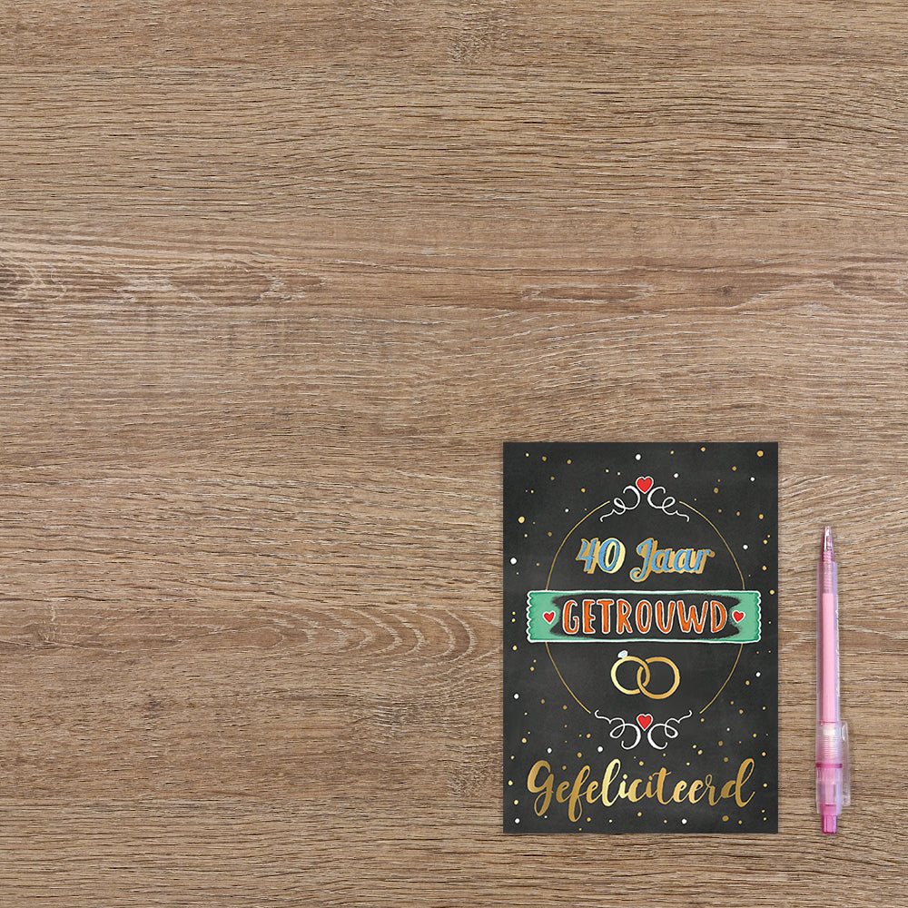 De wenskaart heeft een afmeting van x en een staande vorm. Op deze wenskaart staat de tekst: "40 jaar getrouwd gefeliciteerd". De binnenzijde van de wenskaart is blanco wat voldoende ruimte geeft om een persoonlijke boodschap te schrijven .