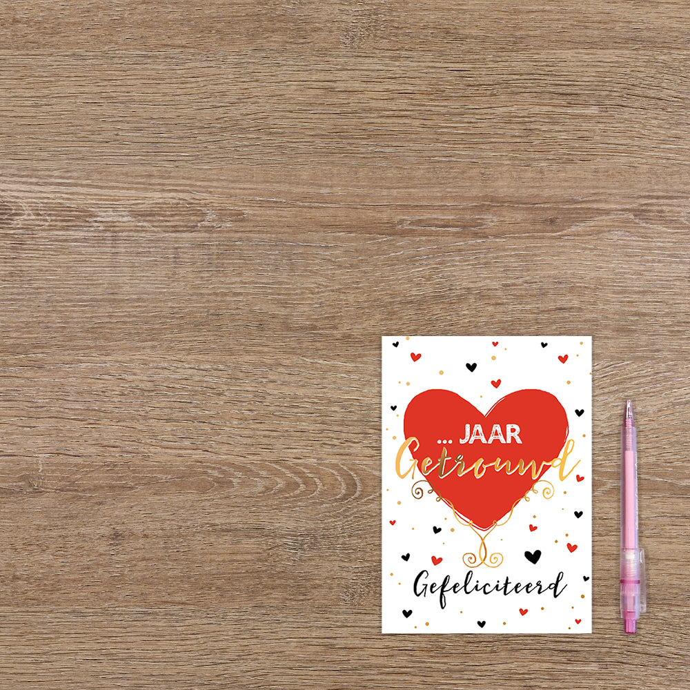 De wenskaart heeft een afmeting van x en een staande vorm. Op deze wenskaart staat een groot roden hart met de tekst: "... jaar getrouwd gefeliciteerd". De binnenzijde van de wenskaart is blanco wat voldoende ruimte geeft om een persoonlijke boodschap te schrijven .