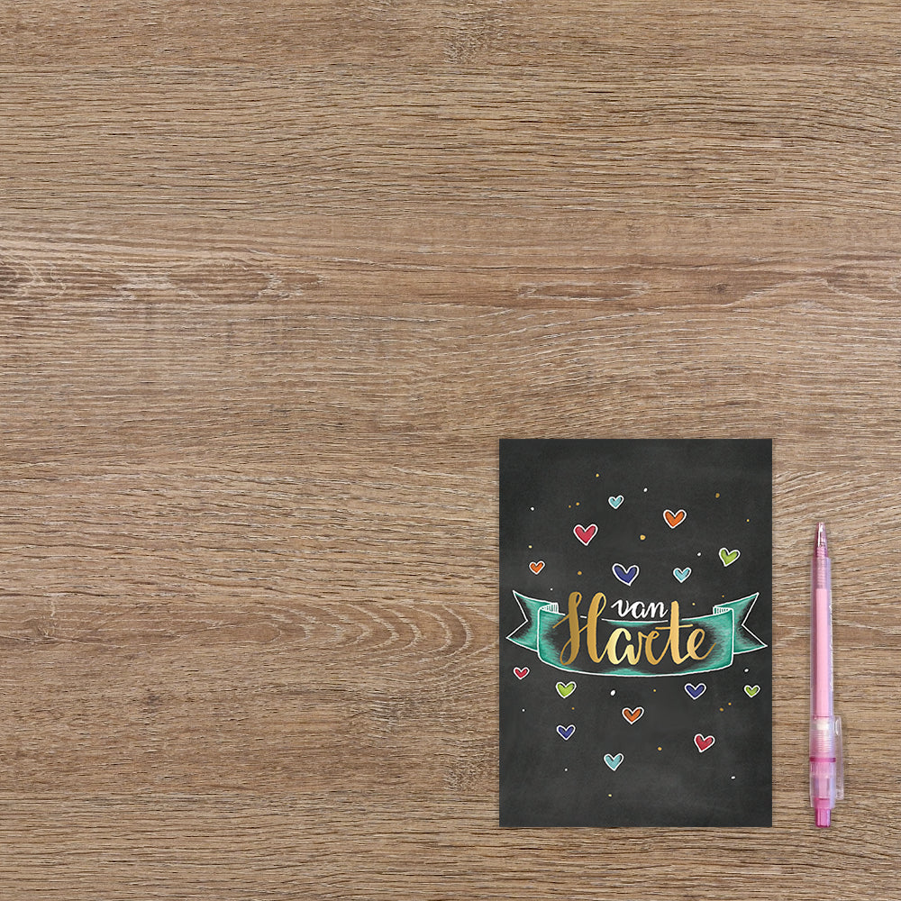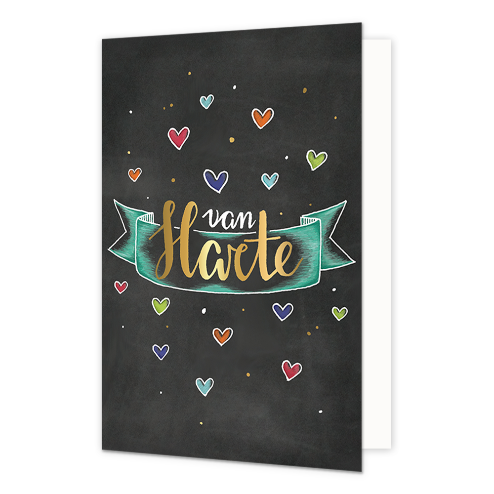 De wenskaart heeft een afmeting van x en een staande vorm. Op deze wenskaart staan hartjes in diverse kleuren met de tekst: "Van harte". De binnenzijde van de wenskaart is blanco wat voldoende ruimte geeft om een persoonlijke boodschap te schrijven .