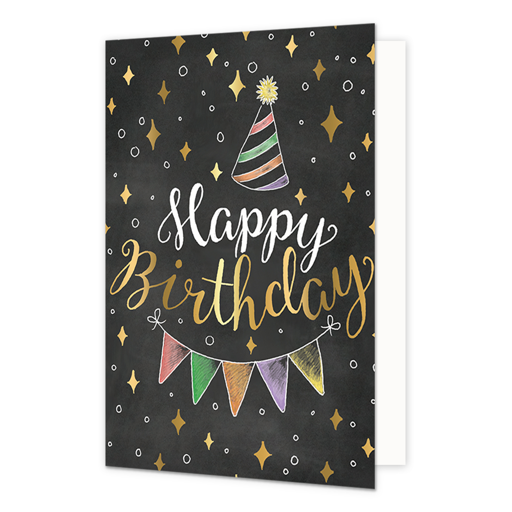 De wenskaart heeft een afmeting van x en een staande vorm. Op deze wenskaart staat een slinger met daarboven de tekst: "Happy birthday". De binnenzijde van de wenskaart is blanco wat voldoende ruimte geeft om een persoonlijke boodschap te schrijven .