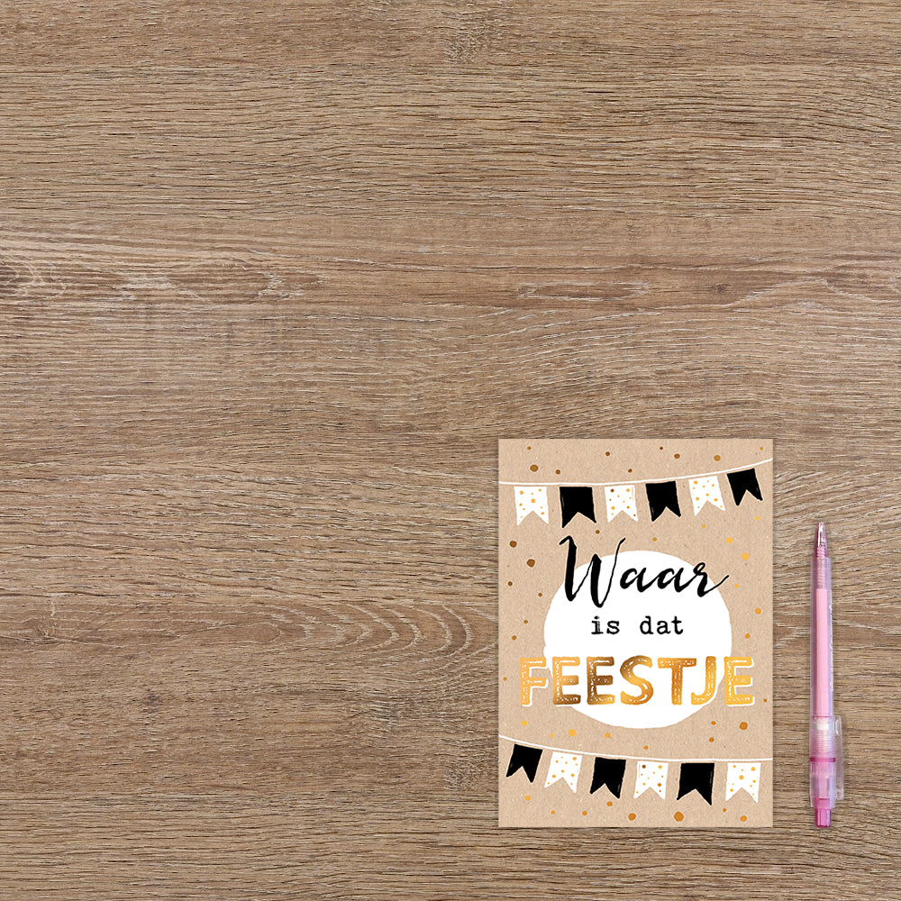 De wenskaart heeft een afmeting van x en een staande vorm. Op deze wenskaart staan slingers met daartussen de tekst: "Waar is dat feestje". De binnenzijde van de wenskaart is blanco wat voldoende ruimte geeft om een persoonlijke boodschap te schrijven .