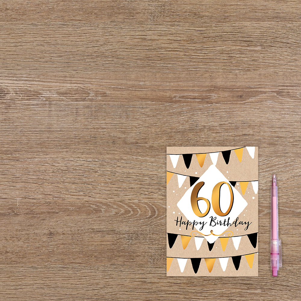 De wenskaart heeft een afmeting van x en een staande vorm. Op deze wenskaart staan slingers met in het midden een ruit met de tekst: "60 Happy birthday". De binnenzijde van de wenskaart is blanco wat voldoende ruimte geeft om een persoonlijke boodschap te schrijven .