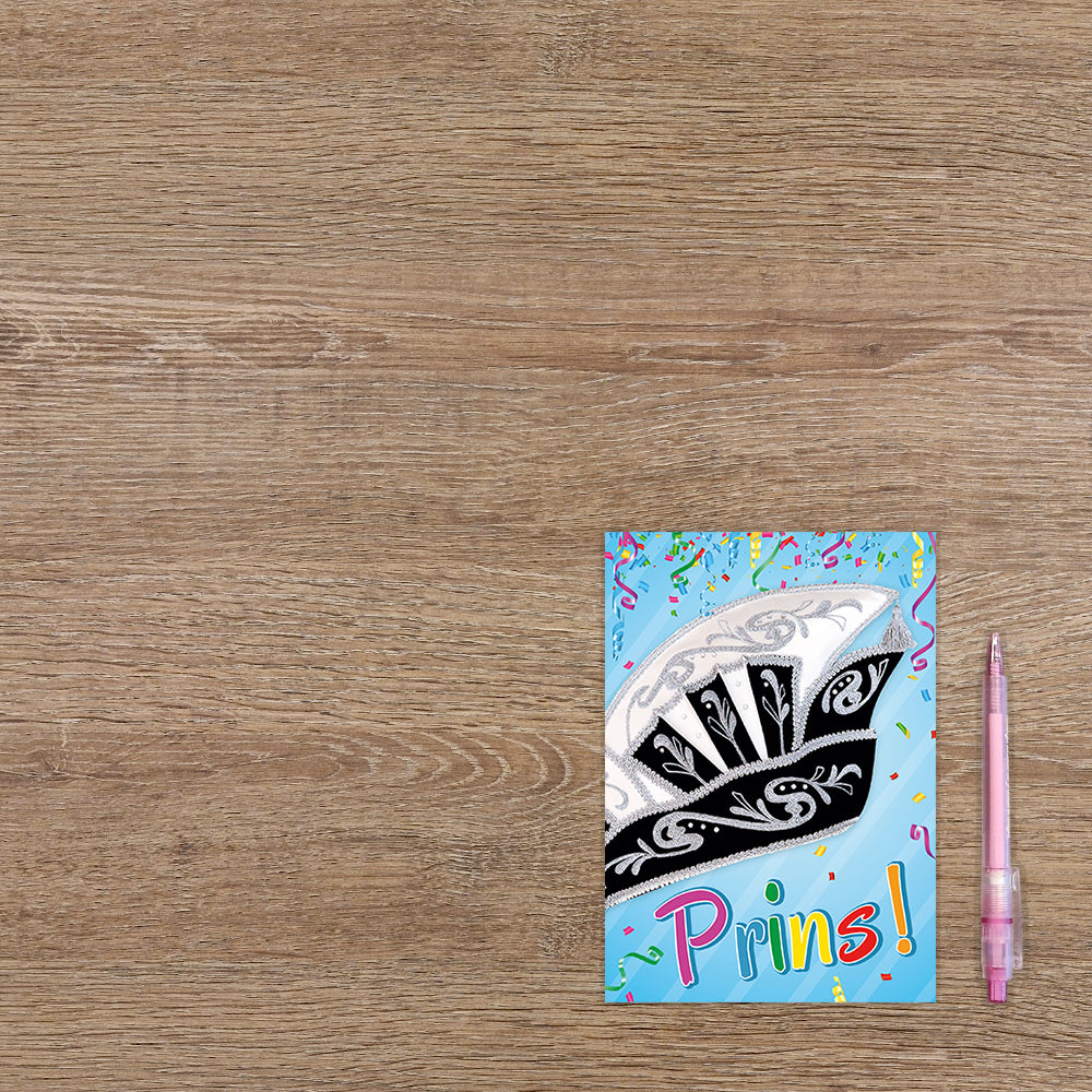 De wenskaart heeft een afmeting van x en een staande vorm. Op deze carnavalskaart staat een prinsensteek met de tekst: "Prins!". De binnenzijde van de wenskaart is blanco wat voldoende ruimte geeft om een persoonlijke boodschap te schrijven .