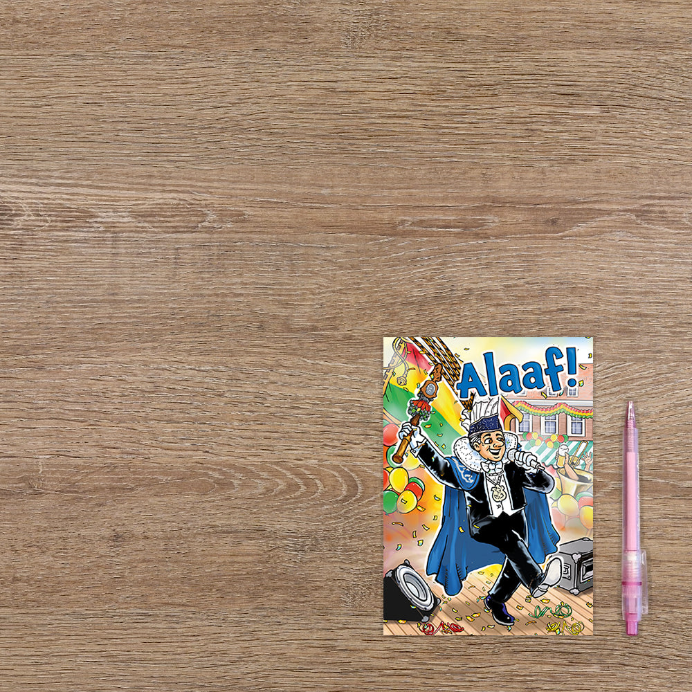 De wenskaart heeft een afmeting van x en een staande vorm. Op deze carnavalskaart staat een carnavalsprins met de tekst: "Alaaf!". De binnenzijde van de wenskaart is blanco wat voldoende ruimte geeft om een persoonlijke boodschap te schrijven .