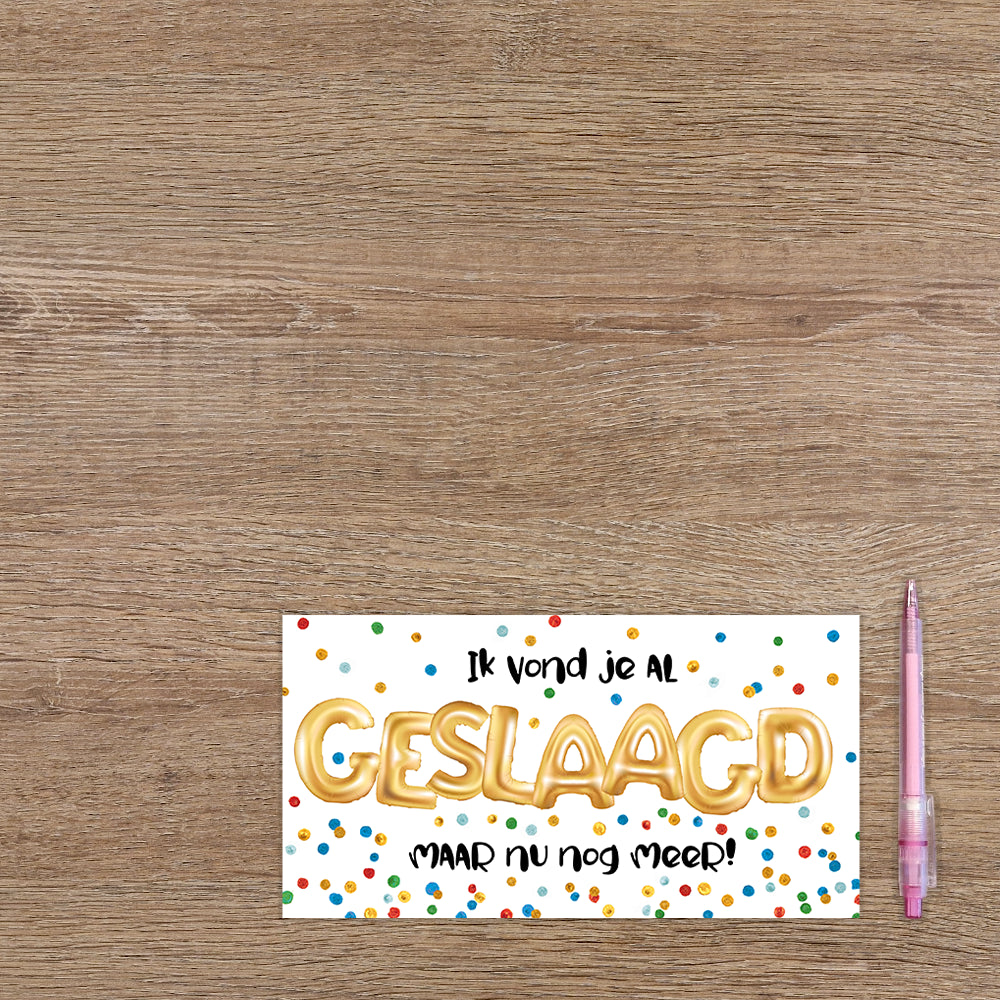 De wenskaart heeft een afmeting van x en een liggende vorm. Op deze wenskaart staat confetti in diverse kleuren met in het midden de tekst: "Ik vond je al geslaagd maar nu nog meer!". De binnenzijde van de wenskaart is blanco wat voldoende ruimte geeft om een persoonlijke boodschap te schrijven .