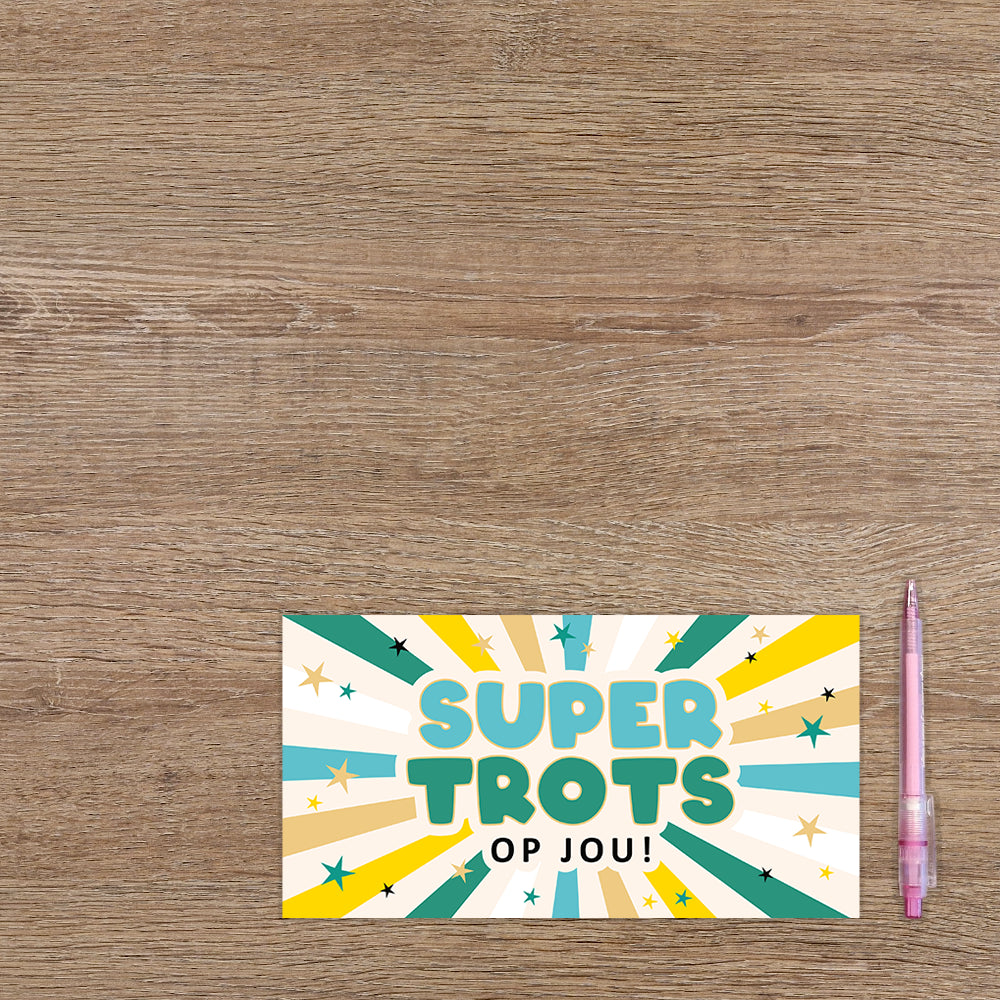 De wenskaart heeft een afmeting van x en een liggende vorm. Op deze wenskaart staan lijnen in de kleuren beige, geel, wit, blauw en groen. In het midden staat de tekst: "Super trots op jou!". De binnenzijde van de wenskaart is blanco wat voldoende ruimte geeft om een persoonlijke boodschap te schrijven .