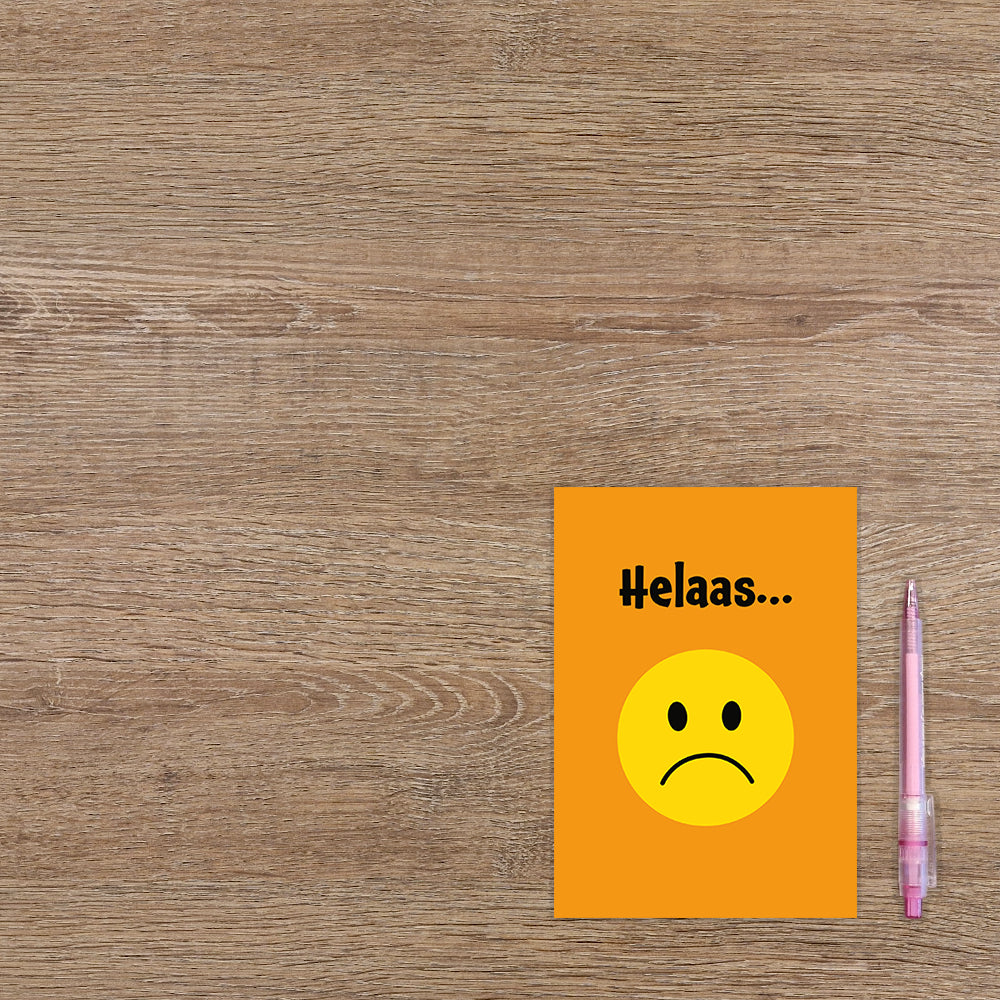 De wenskaart heeft een afmeting van x en een staande vorm. Op deze wenskaart staat een verdrietige smiley met daarboven de tekst: "Helaas...". De binnenzijde van de wenskaart is blanco wat voldoende ruimte geeft om een persoonlijke boodschap te schrijven .
