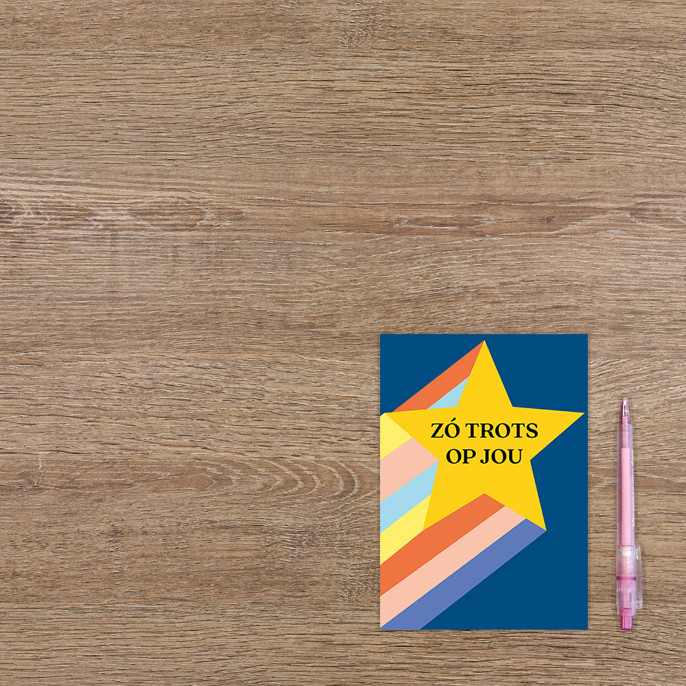 De wenskaart heeft een afmeting van x en een staande vorm. Op deze wenskaart staat een grote gele ster met de tekst: "Zó trots op jou". De binnenzijde van de wenskaart is blanco wat voldoende ruimte geeft om een persoonlijke boodschap te schrijven .