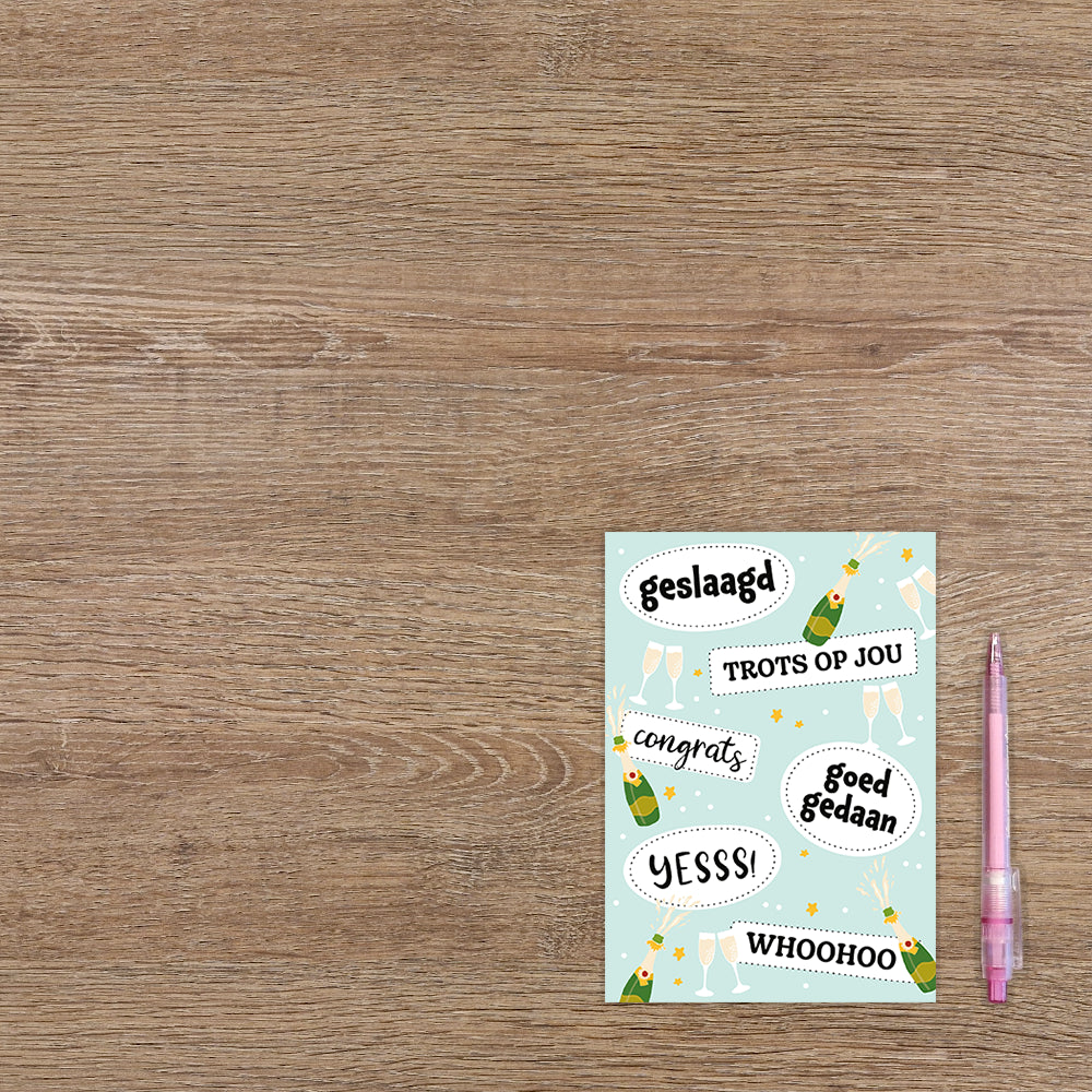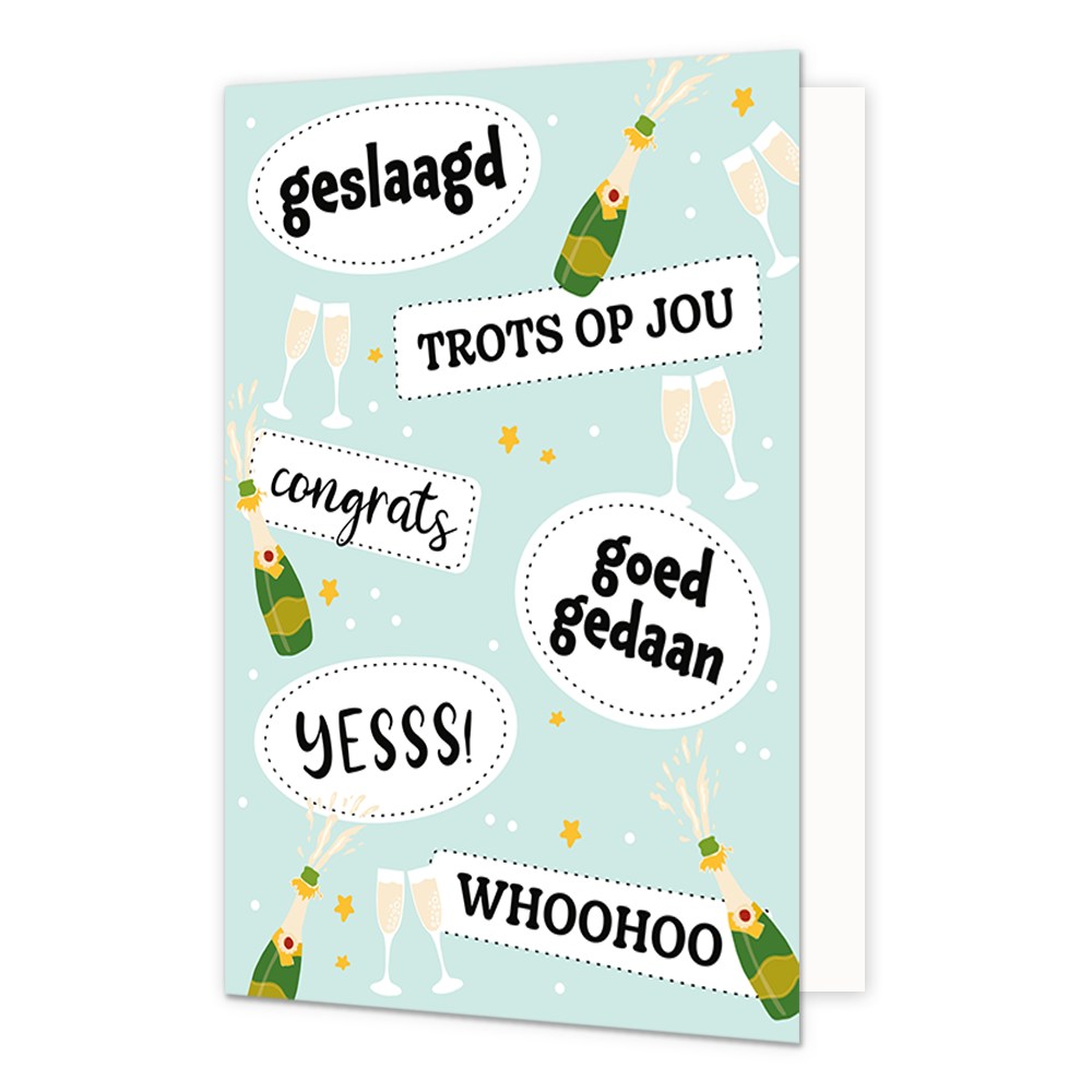 De wenskaart heeft een afmeting van x en een staande vorm. Op deze wenskaart staan champagneflessen en glazen met de teksten: "Geslaagd", "Trots op jou", "Congrats", "Goed gedaan", "Yesss!" en "Whoohoo". De binnenzijde van de wenskaart is blanco wat voldoende ruimte geeft om een persoonlijke boodschap te schrijven .