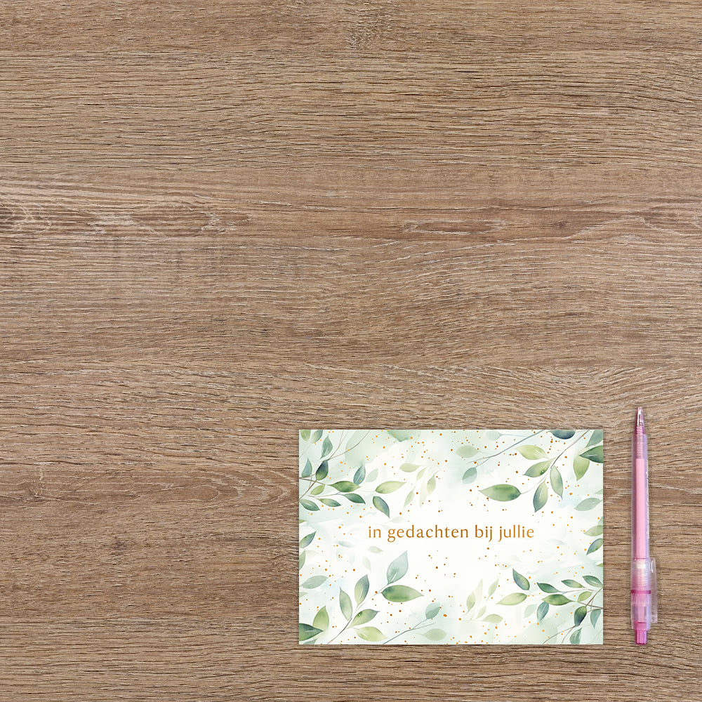 De wenskaart heeft een afmeting van x en een liggende vorm. Op deze wenskaart staan groene bladeren en gouden stippen met in het midden de tekst: "In gedachten bij jullie". De binnenzijde van de wenskaart is blanco wat voldoende ruimte geeft om een persoonlijke boodschap te schrijven .