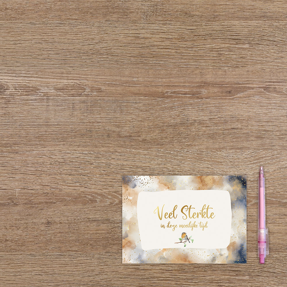 De wenskaart heeft een afmeting van x en een liggende vorm. Op deze artistieke wenskaart is een ontwerp te zien met de kleuren bruin, beige, wit, grijs en goud. In het midden zit een wit vlak met de tekst: "Veel sterkte in deze moeilijke tijd". De binnenzijde van de wenskaart is blanco wat voldoende ruimte geeft om een persoonlijke boodschap te schrijven .