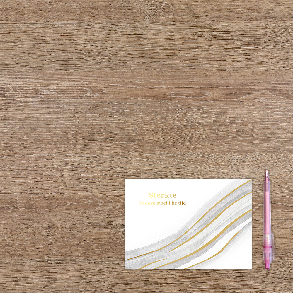 De wenskaart heeft een afmeting van x en een liggende vorm. Op deze wenskaart staan lijnen in de kleuren wit, grijs en goud met daarnaast de tekst: "Sterkte in deze moeilijke tijd". De binnenzijde van de wenskaart is blanco wat voldoende ruimte geeft om een persoonlijke boodschap te schrijven .