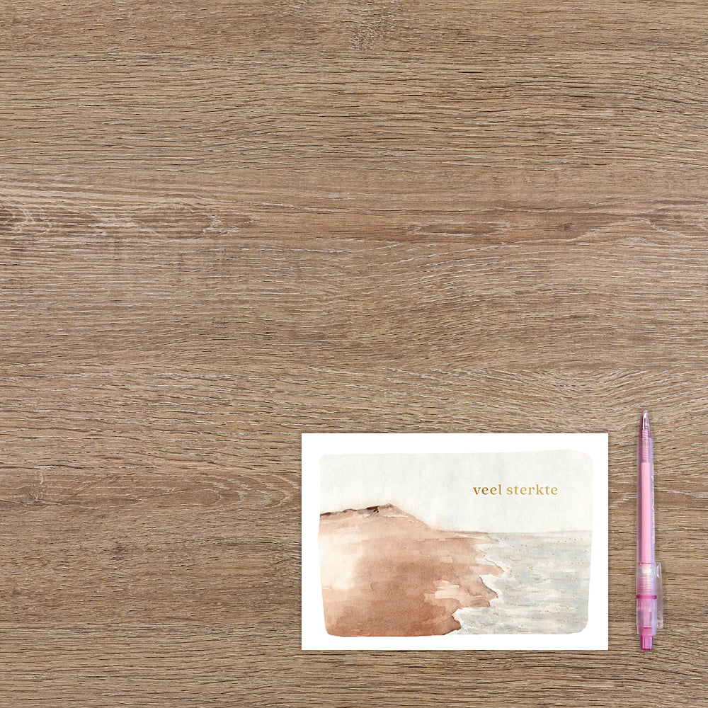 De wenskaart heeft een afmeting van x en een liggende vorm. Op deze artistieke wenskaart is een strand met de zee afgebeeld. In de illustratie staat de tekst: "Veel sterkte". De binnenzijde van de wenskaart is blanco wat voldoende ruimte geeft om een persoonlijke boodschap te schrijven .