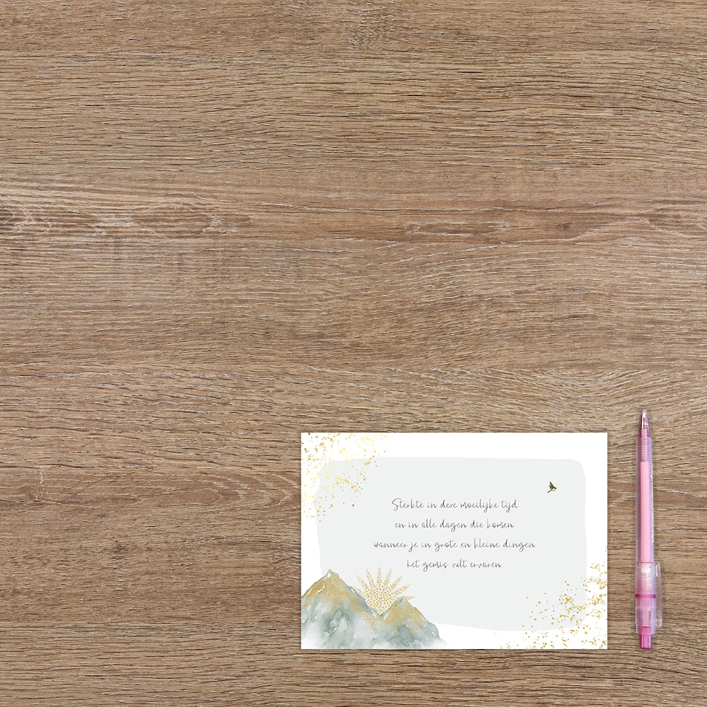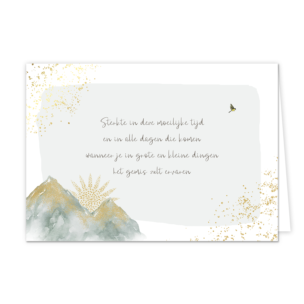 De wenskaart heeft een afmeting van x en een liggende vorm. Op deze wenskaart is een zon te zien die boven de bergen uit schijnt. In de illustratie staat de tekst: "Sterkte in deze moeilijke tijd en in alle dagen die komen wanneer je in grote en kleine dingen het gemis zult ervaren". De binnenzijde van de wenskaart is blanco wat voldoende ruimte geeft om een persoonlijke boodschap te schrijven .