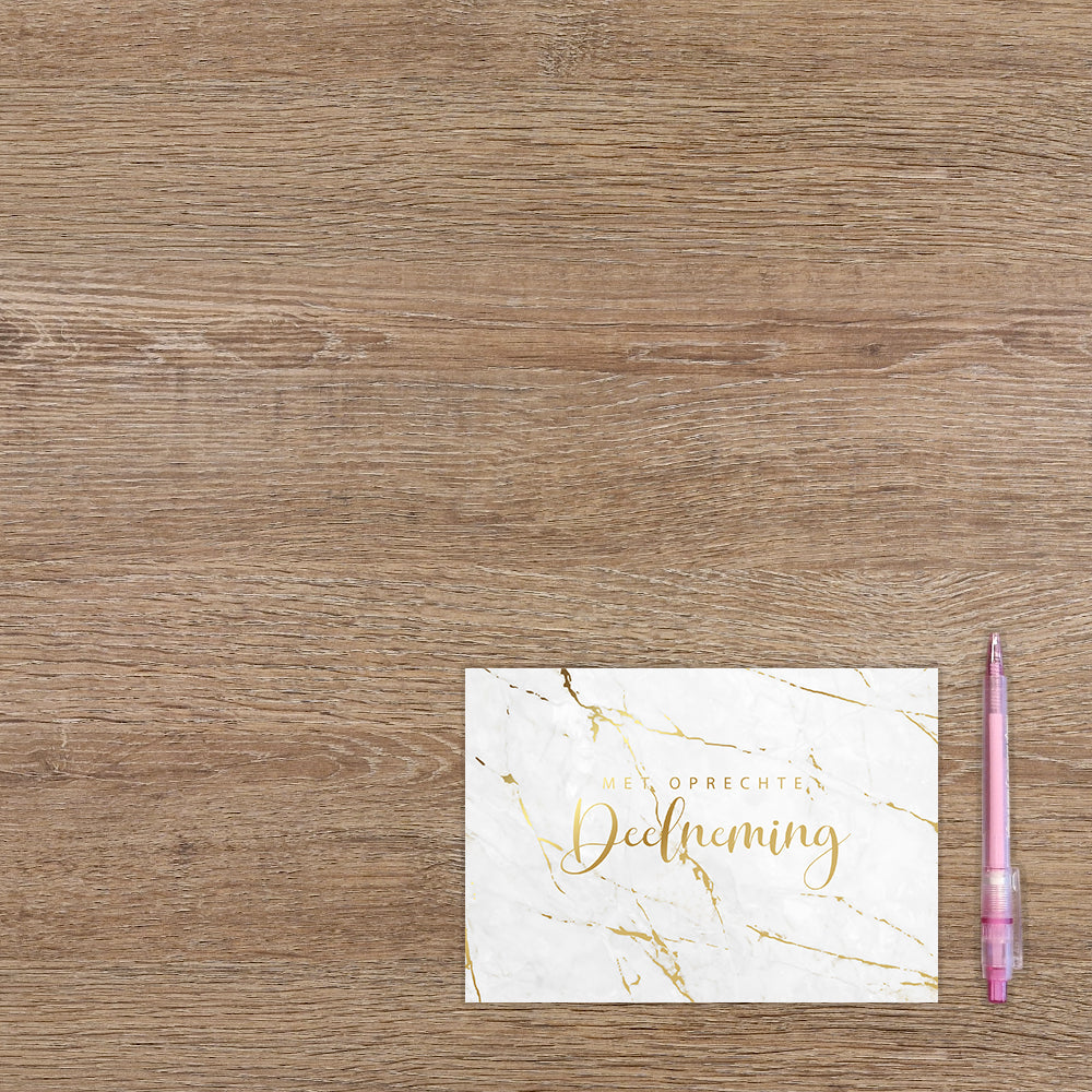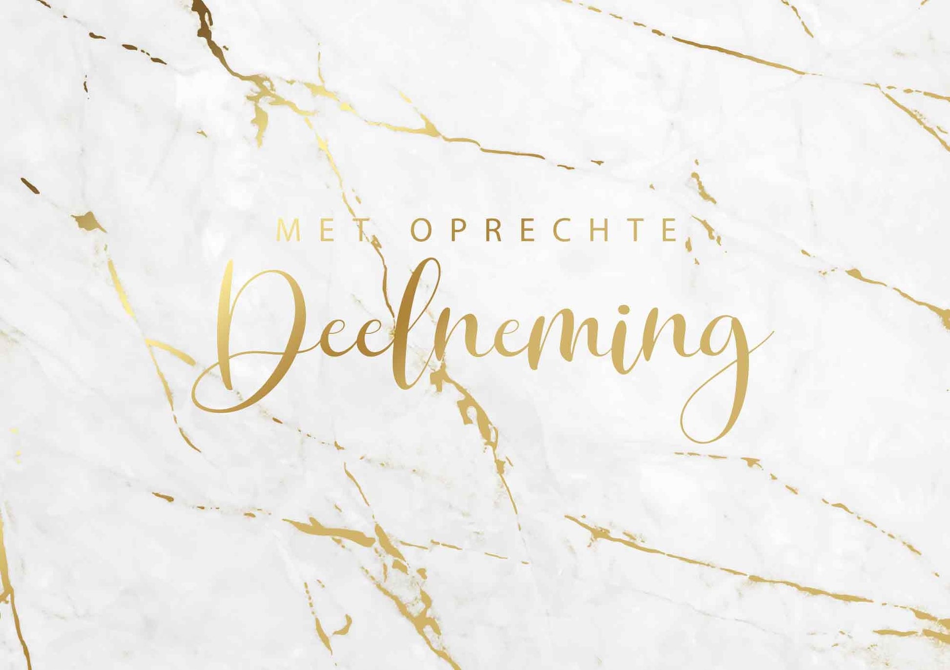 De wenskaart heeft een afmeting van x en een liggende vorm. Op deze wenskaart staan gouden lijnen met in het midden de tekst: "Met oprechte deelneming". De binnenzijde van de wenskaart is blanco wat voldoende ruimte geeft om een persoonlijke boodschap te schrijven .