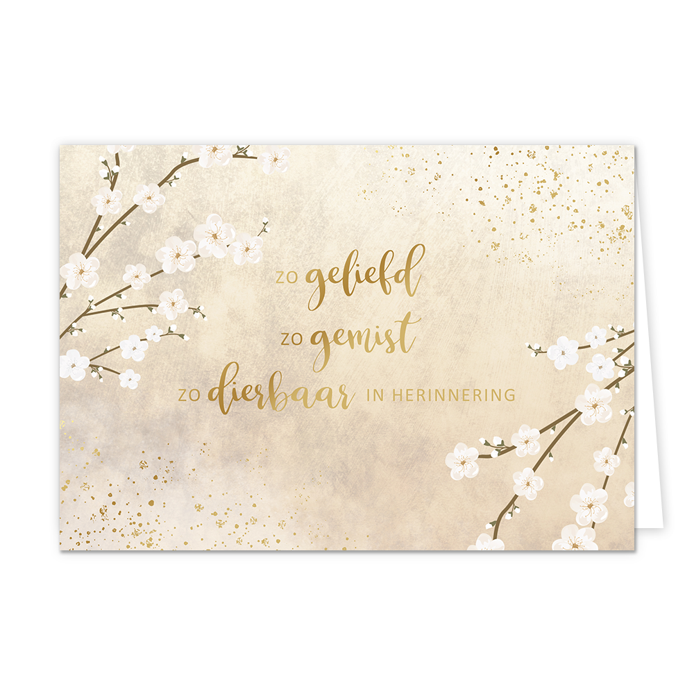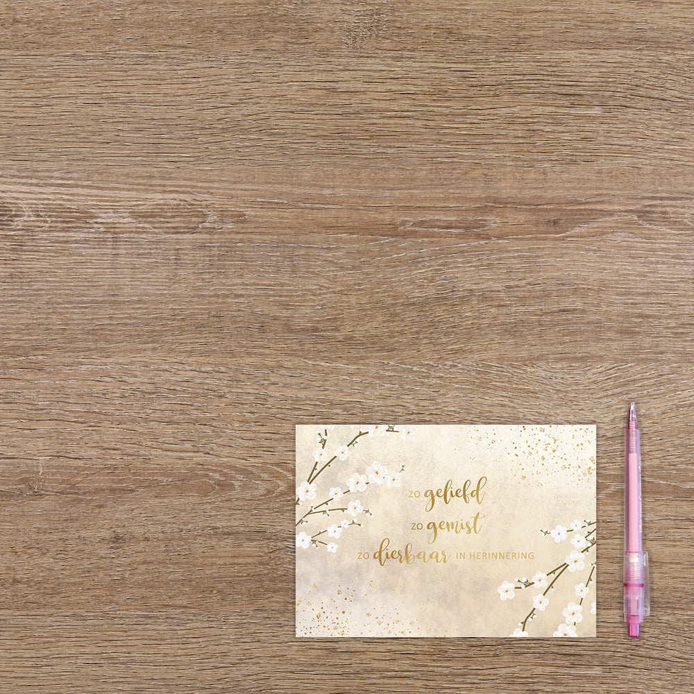 De wenskaart heeft een afmeting van x en een liggende vorm. Op deze wenskaart staat kersenbloesem met in het midden de tekst: "Zo geliefd zo gemist zo dierbaar in herinnering". De binnenzijde van de wenskaart is blanco wat voldoende ruimte geeft om een persoonlijke boodschap te schrijven .