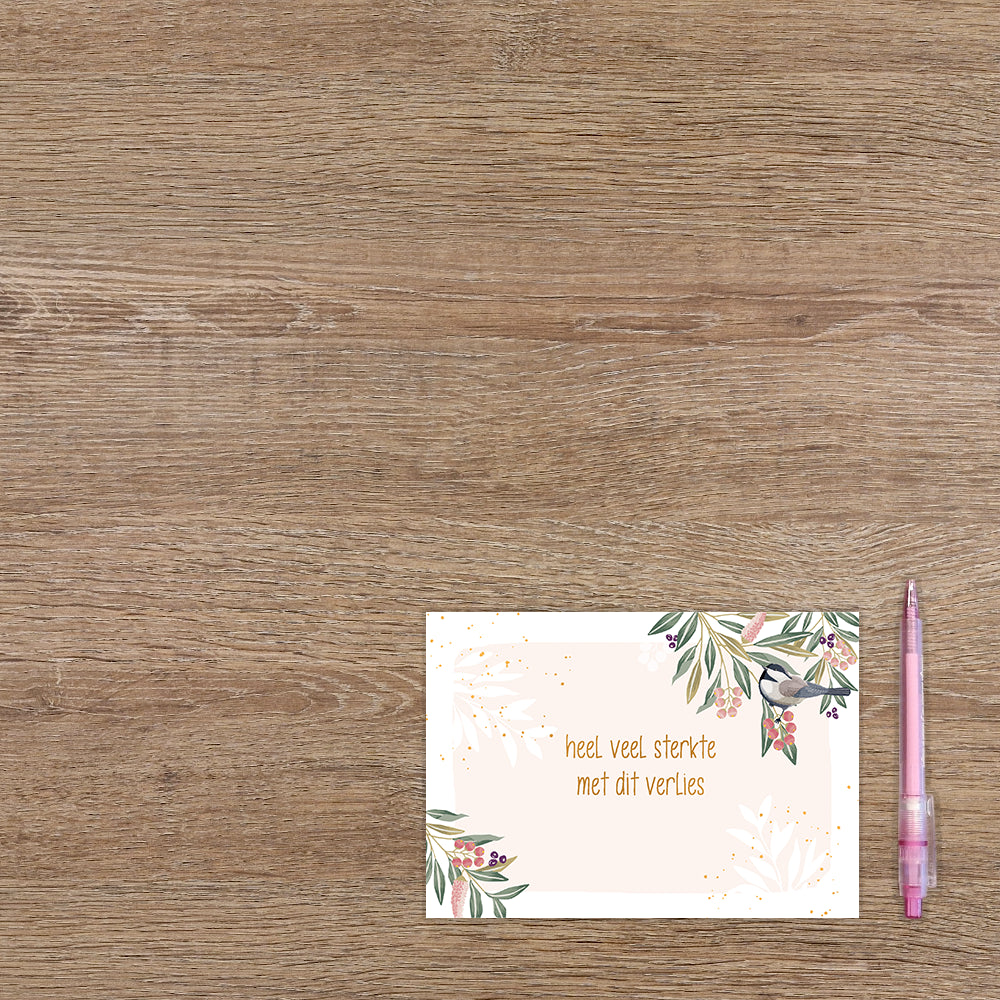 De wenskaart heeft een afmeting van x en een liggende vorm. Op deze wenskaart staan planten met roze, rode en paarse bloemen en een vogel. In het midden staat de tekst: "Heel veel sterkte met dit verlies". De binnenzijde van de wenskaart is blanco wat voldoende ruimte geeft om een persoonlijke boodschap te schrijven .
