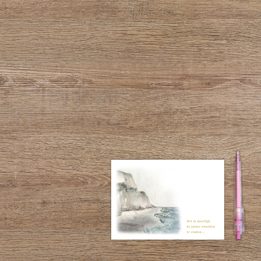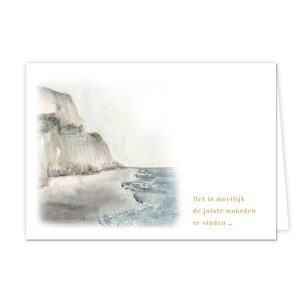 De wenskaart heeft een afmeting van x en een liggende vorm. Op deze wenskaart staan heuvels met een strand en de zee. Daarnaast staat de tekst: "Het is moeilijk de juiste woorden te vinden...". De binnenzijde van de wenskaart is blanco wat voldoende ruimte geeft om een persoonlijke boodschap te schrijven .
