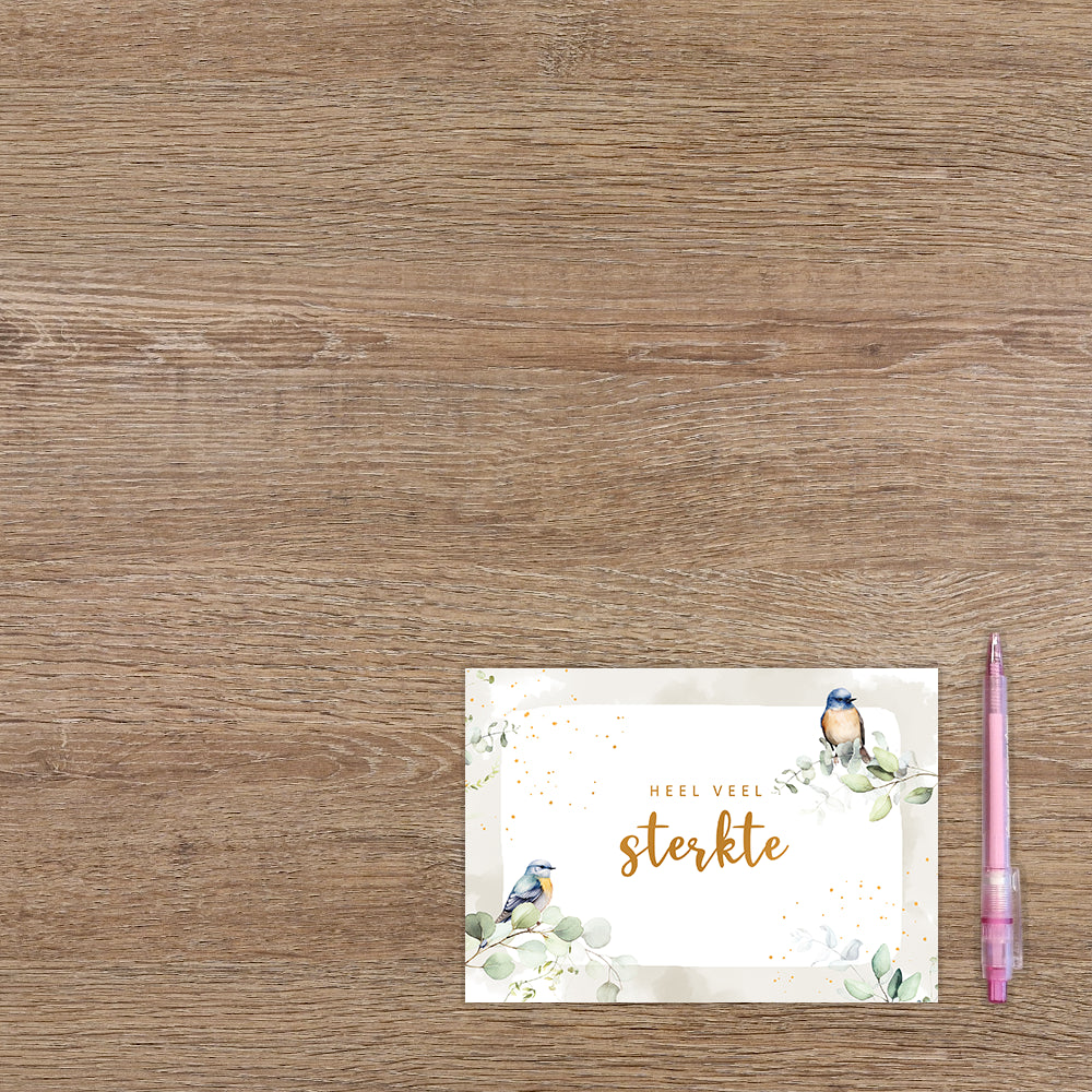De wenskaart heeft een afmeting van x en een liggende vorm. Op deze wenskaart staan twee vogels die op takjes met groene bladeren zitten. In het midden staat de tekst: "Heel veel sterkte". De binnenzijde van de wenskaart is blanco wat voldoende ruimte geeft om een persoonlijke boodschap te schrijven .