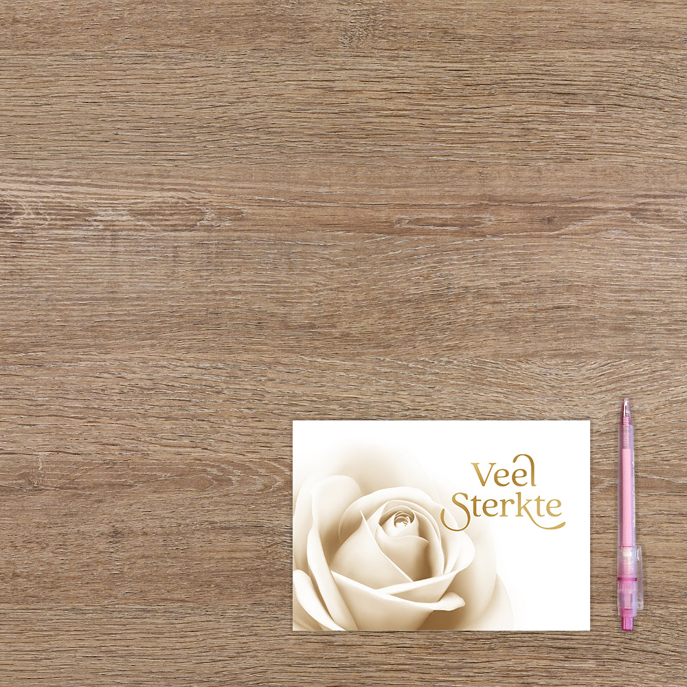 De wenskaart heeft een afmeting van x en een liggende vorm. Op deze wenskaart staat een witte roos met daarnaast de tekst: "Veel sterkte". De binnenzijde van de wenskaart is blanco wat voldoende ruimte geeft om een persoonlijke boodschap te schrijven .