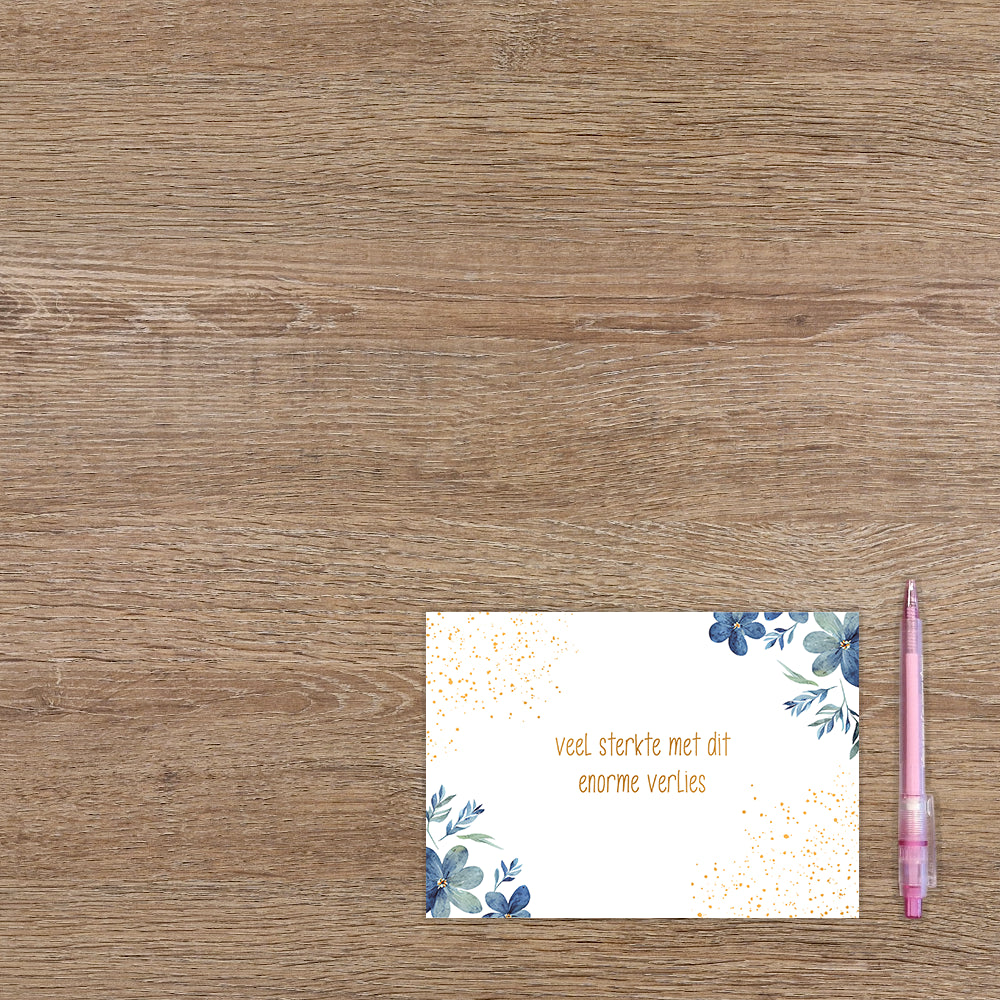 De wenskaart heeft een afmeting van x en een liggende vorm. Op deze wenskaart staan blauwe bloemen met daarnaast gouden stippen en in het midden de tekst: "Veel sterkte met dit enorme verlies". De binnenzijde van de wenskaart is blanco wat voldoende ruimte geeft om een persoonlijke boodschap te schrijven .