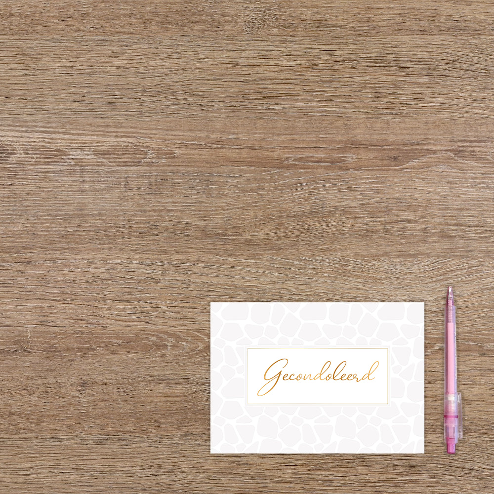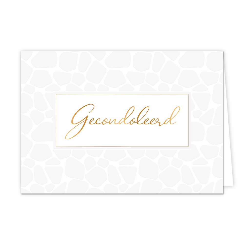 De wenskaart heeft een afmeting van x en een liggende vorm. Op deze wenskaart staat de tekst: "Gecondoleerd" in het goud. De binnenzijde van de wenskaart is blanco wat voldoende ruimte geeft om een persoonlijke boodschap te schrijven .
