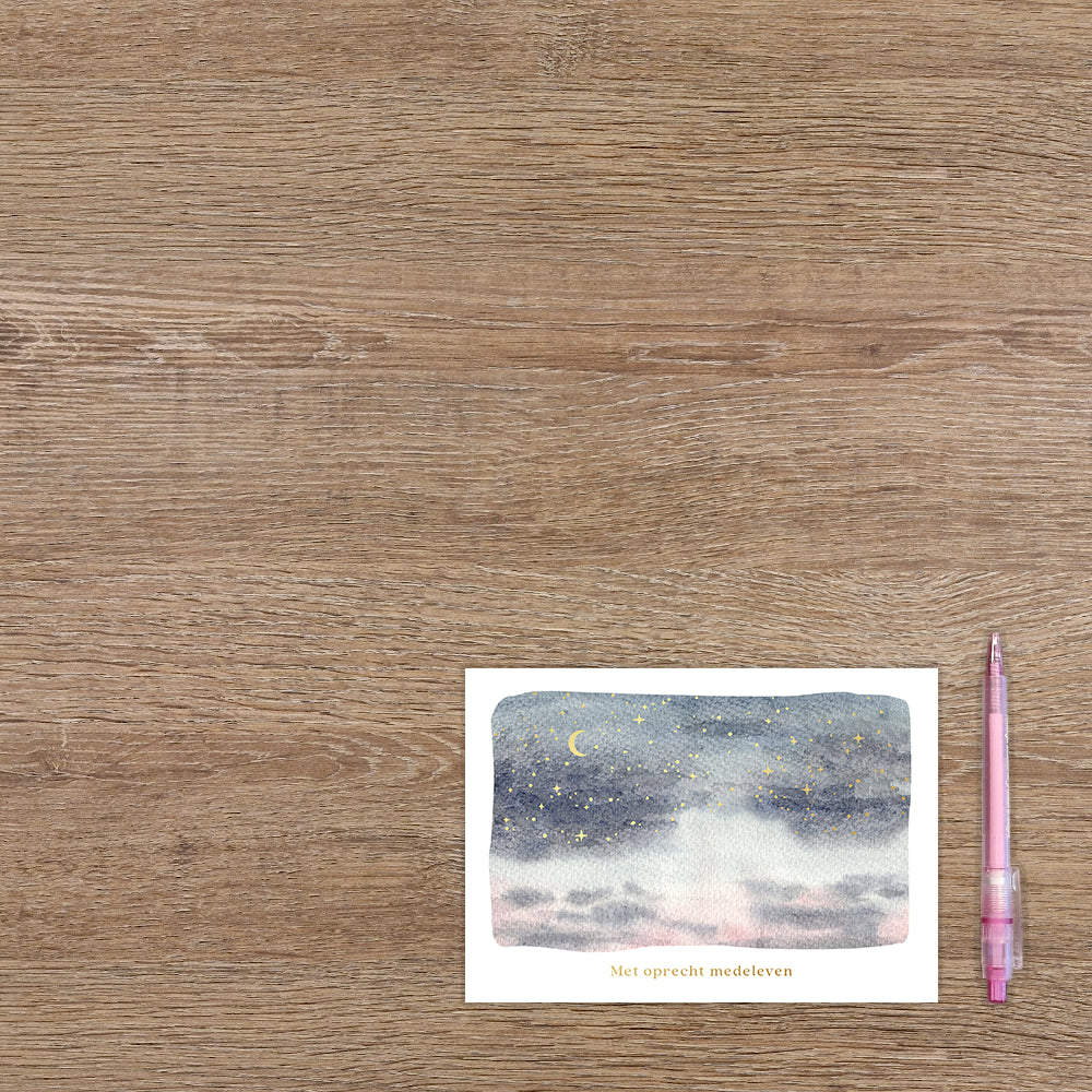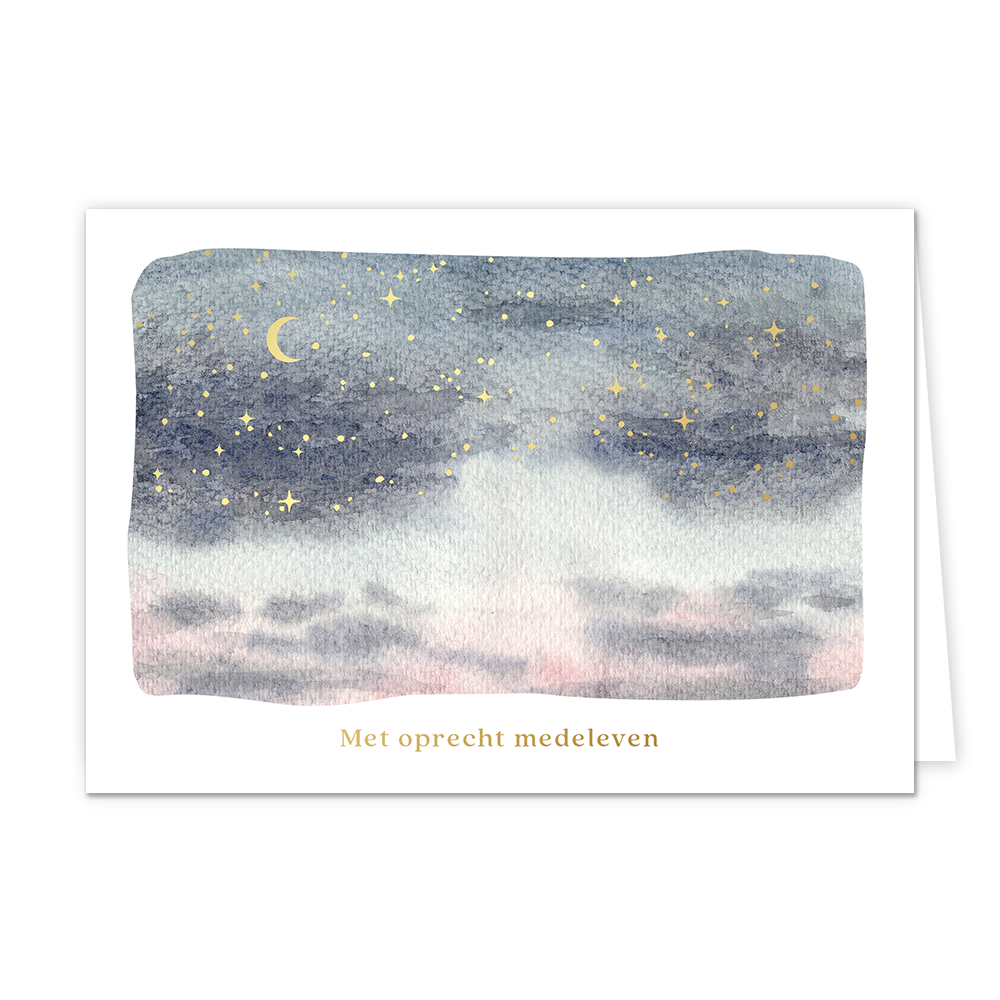 De wenskaart heeft een afmeting van x en een liggende vorm. Op deze wenskaart staat de ruimte met gouden sterren en een gouden halve maan. Onder de illustratie staat de tekst: "Met oprecht medeleven". De binnenzijde van de wenskaart is blanco wat voldoende ruimte geeft om een persoonlijke boodschap te schrijven .