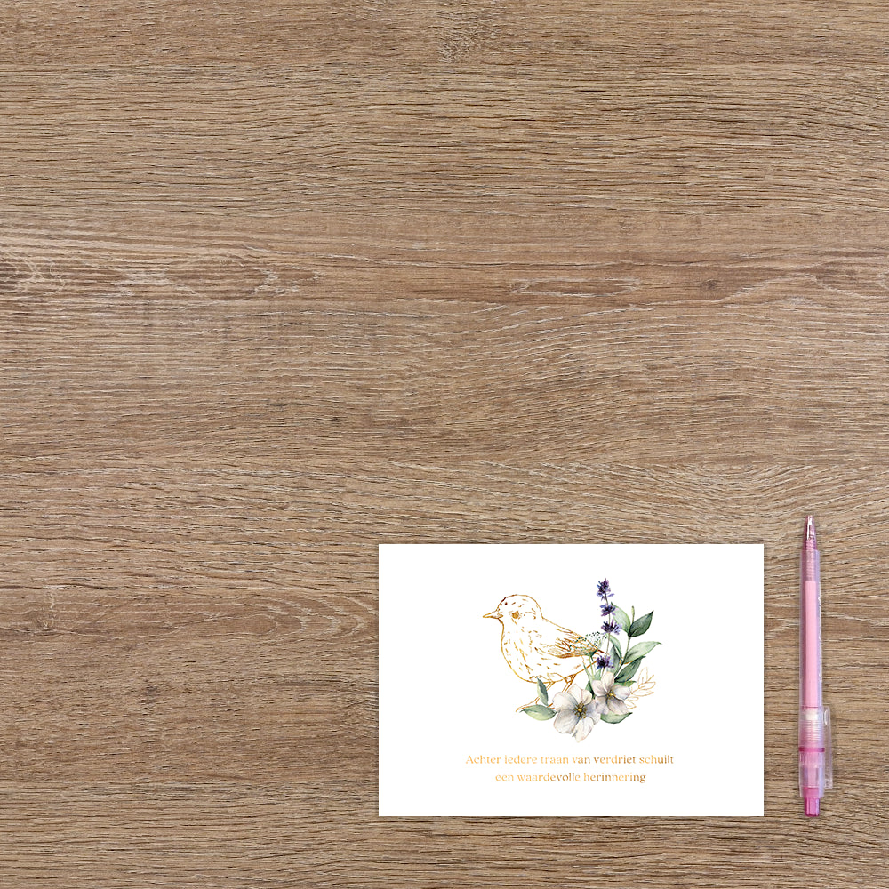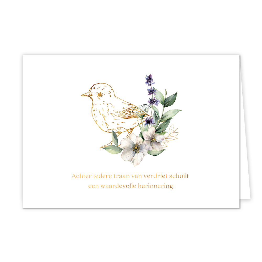 De wenskaart heeft een afmeting van x en een liggende vorm. Op deze wenskaart staat een gouden vogel met een bloemetje ernaast. Onder de illustratie staat de tekst: "Achter iedere traan van verdriet schuilt een waardevolle herinnering". De binnenzijde van de wenskaart is blanco wat voldoende ruimte geeft om een persoonlijke boodschap te schrijven .