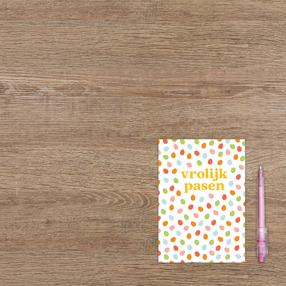 De wenskaart heeft een afmeting van x en een staande vorm. Op deze paaskaart staan stippen in de kleuren oranje, blauw, groen, rood en roze met in het midden de tekst: "Vrolijk pasen". De binnenzijde van de wenskaart is blanco wat voldoende ruimte geeft om een persoonlijke boodschap te schrijven .
