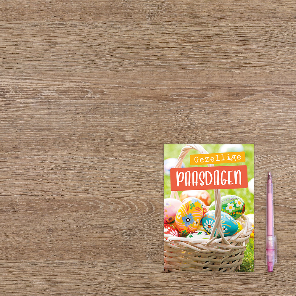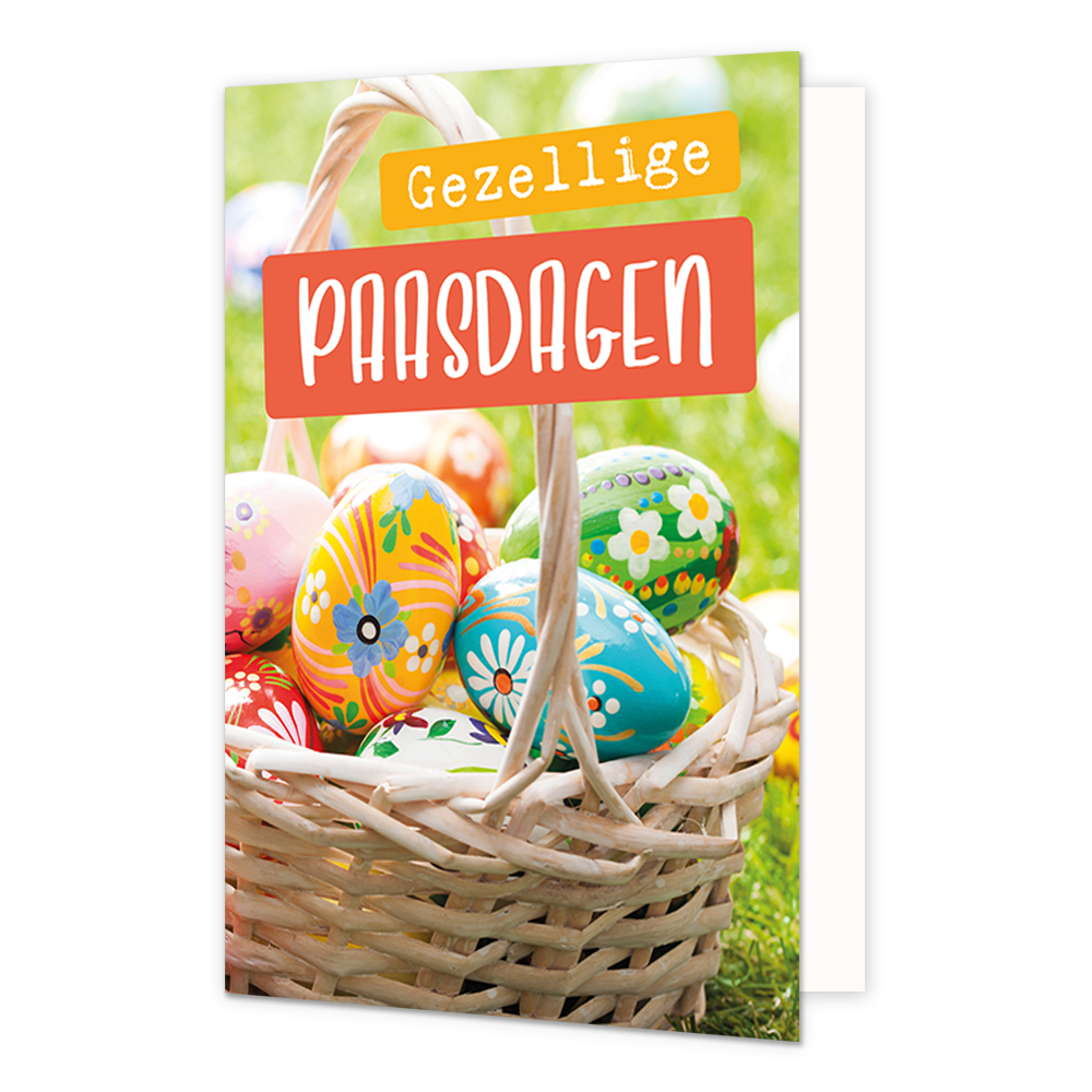 De wenskaart heeft een afmeting van x en een staande vorm. Op deze paaskaart staat een mandje met gekleurde eiren en de tekst: "Gezellige paasdagen". De binnenzijde van de wenskaart is blanco wat voldoende ruimte geeft om een persoonlijke boodschap te schrijven .