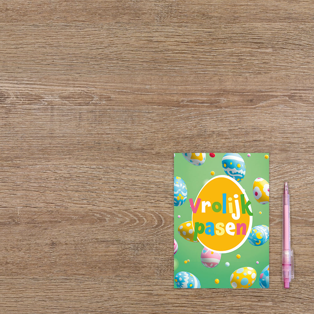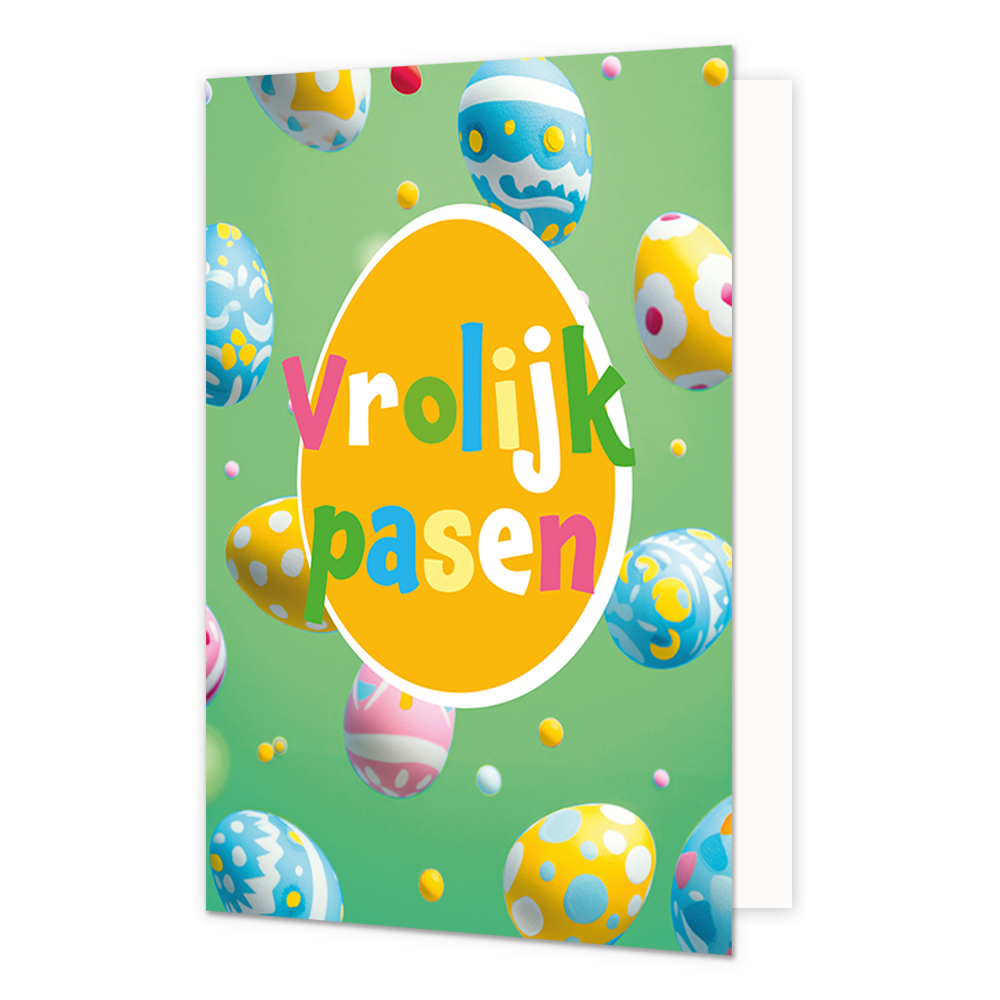 De wenskaart heeft een afmeting van x en een staande vorm. Op deze paaskaart staan gekleurde eiren met de tekst: "Vrolijk pasen". De binnenzijde van de wenskaart is blanco wat voldoende ruimte geeft om een persoonlijke boodschap te schrijven .