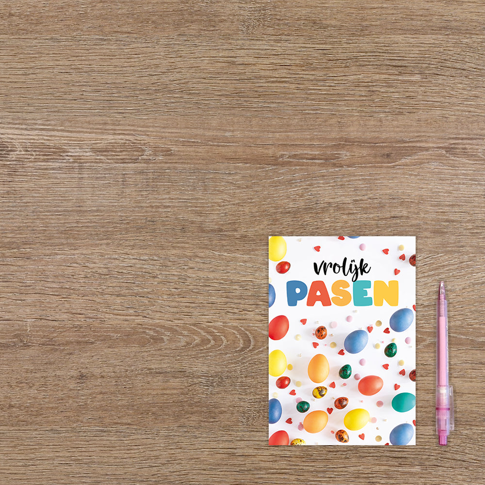 De wenskaart heeft een afmeting van x en een staande vorm. Op deze paaskaart staan gekleurde eiren met de tekst: "Vrolijk pasen". De binnenzijde van de wenskaart is blanco wat voldoende ruimte geeft om een persoonlijke boodschap te schrijven .