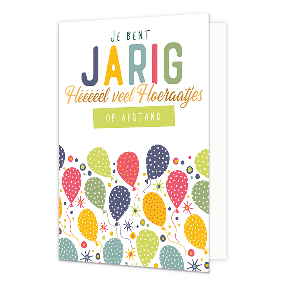 De wenskaart heeft een afmeting van x en een staande vorm. Op deze wenskaart staan ballonnen in de kleuren groen, blauw, rood en geel, met daarboven de tekst: "Je bent jarig héél veel hoeraatjes op afstand". De binnenzijde van de wenskaart is blanco wat voldoende ruimte geeft om een persoonlijke boodschap te schrijven .