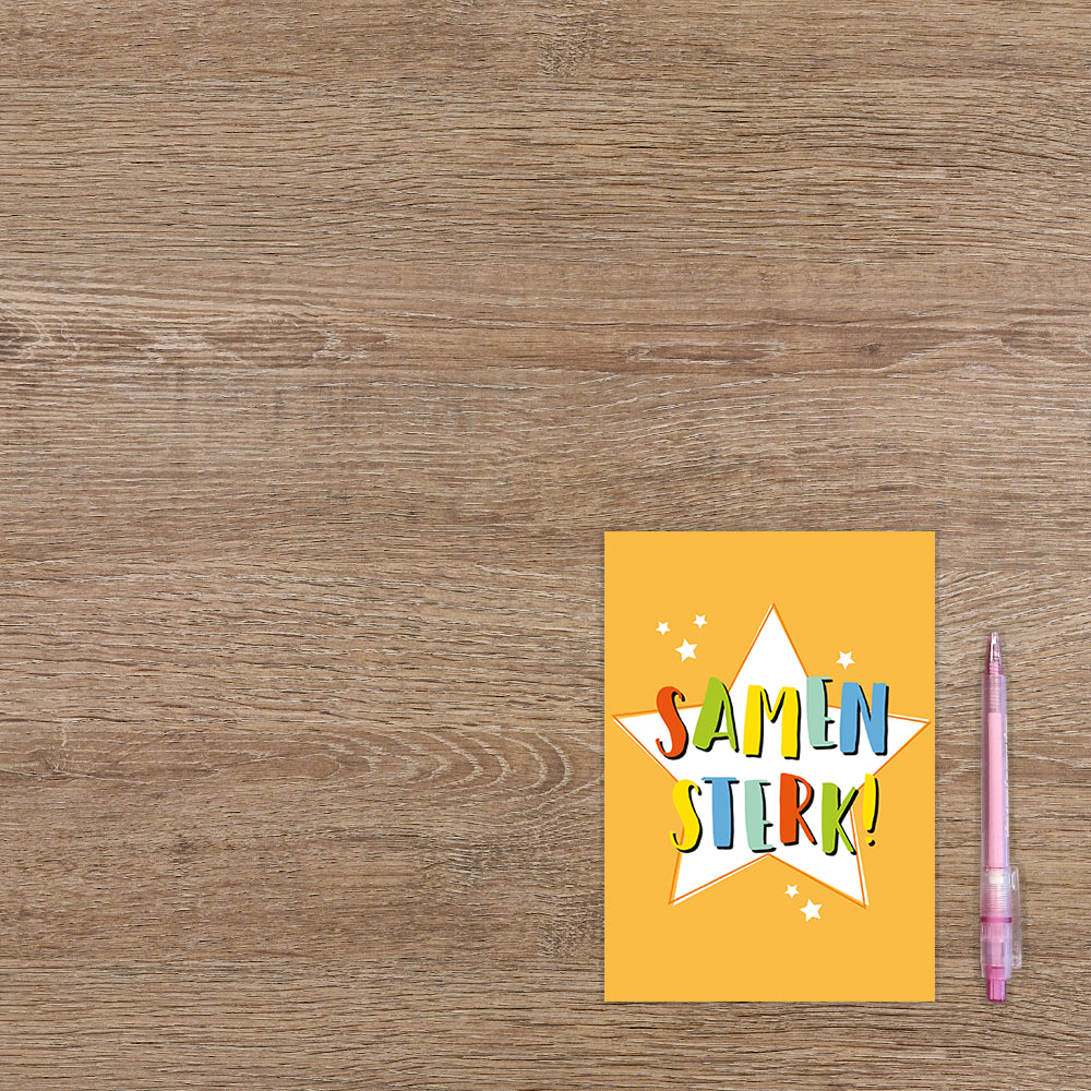 De wenskaart heeft een afmeting van x en een staande vorm. Op deze wenskaart staan witte sterren op een oranje achtergrond met de tekst: "Samen sterk!". De binnenzijde van de wenskaart is blanco wat voldoende ruimte geeft om een persoonlijke boodschap te schrijven .