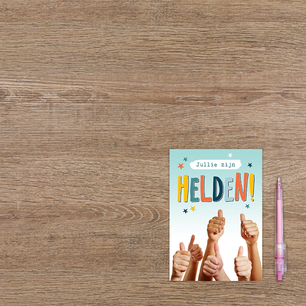 De wenskaart heeft een afmeting van x en een staande vorm. Op deze wenskaart staan duimen met daarboven de tekst: "Jullie zijn helden". De binnenzijde van de wenskaart is blanco wat voldoende ruimte geeft om een persoonlijke boodschap te schrijven .