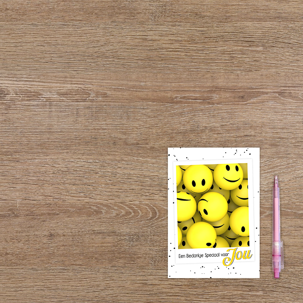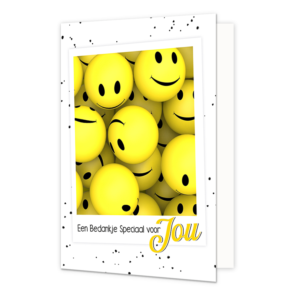 De wenskaart heeft een afmeting van x en een staande vorm. Op deze wenskaart staan smiley's met daaronder de tekst: "Een bedankje speciaal voor jou". De binnenzijde van de wenskaart is blanco wat voldoende ruimte geeft om een persoonlijke boodschap te schrijven .