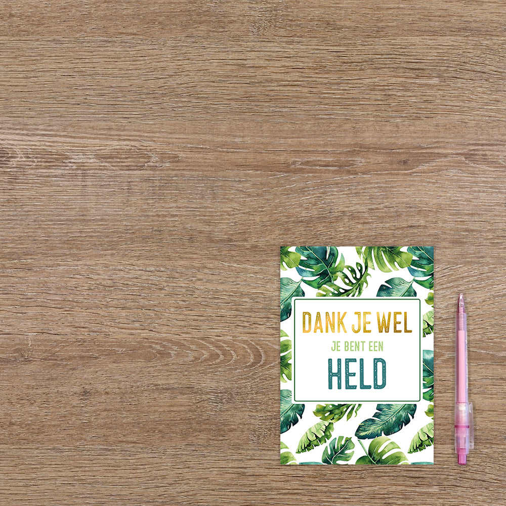 De wenskaart heeft een afmeting van x en een staande vorm. Op deze wenskaart staan groene bladeren met in het midden de tekst: "Dank je wel je bent een held". De binnenzijde van de wenskaart is blanco wat voldoende ruimte geeft om een persoonlijke boodschap te schrijven .